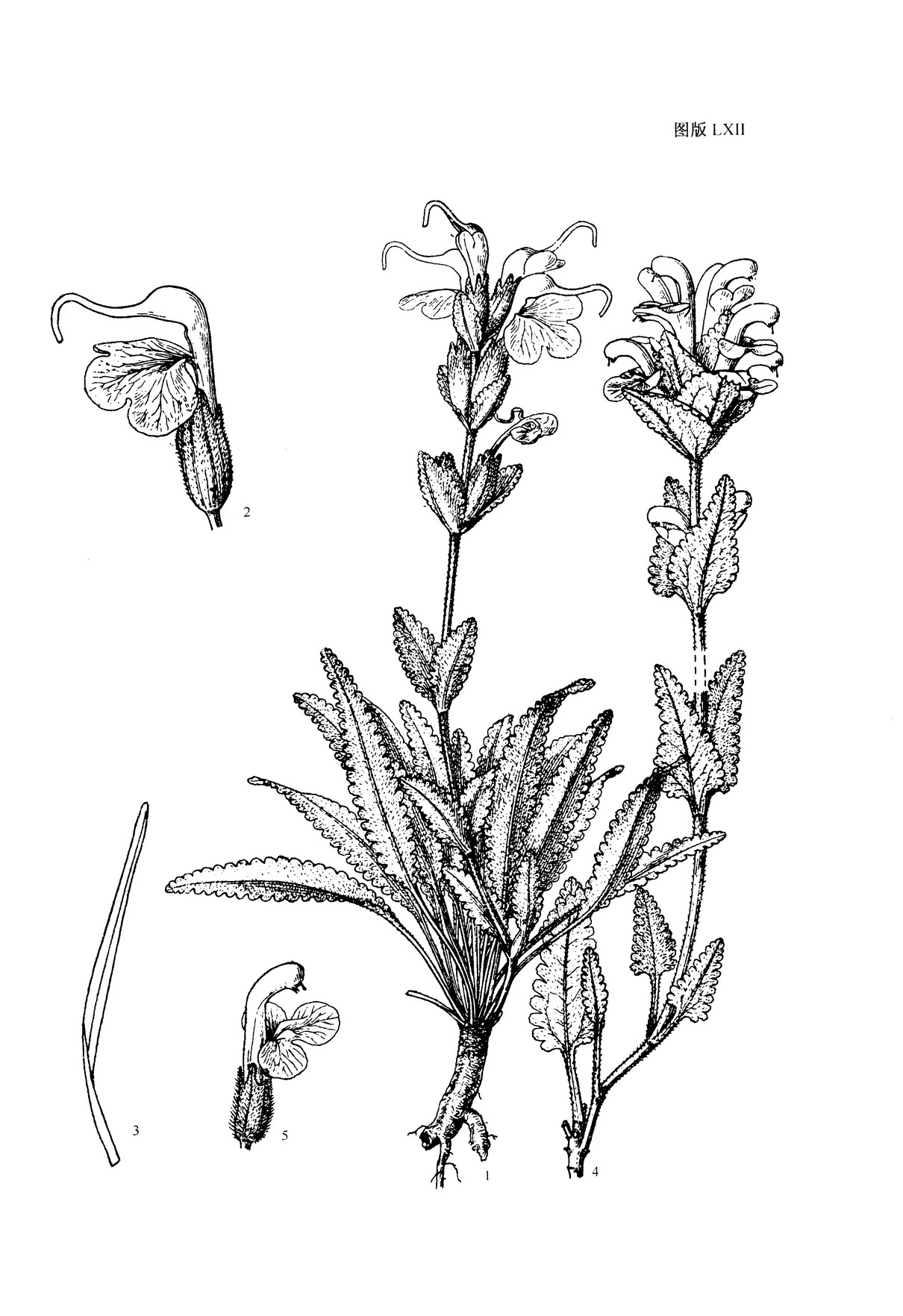 低矮多年生草本,高4-7厘米,干时变黑。根茎变粗,长2-3厘米,径可达1.5厘米,发出纺锤形肉质的根,长达3-4厘米。茎单条或多条,自根颈发出,弯曲上升。叶狭长圆状披针形,基生者成丛,有长柄达3-5厘米,其叶片长3-5厘米,宽0.5厘米,茎生者2-4对,无柄,叶片狭长圆形,长1.3-1.5厘米,宽0.75-1厘米,均有波状圆齿。花无梗,花轮聚生茎端,有时下方有疏距者;苞片叶状,长于萼或相等;萼圆筒状钟形,有腺毛,前方开裂1/3,长12厘米,有疏网纹,齿5枚,后方1枚较小,其余4枚长圆形,缘有波齿而常反卷;花冠深紫色,管长20毫米,伸直,下唇3裂,宽18毫米,侧裂椭圆形,大于中裂1倍,后者儿为圆形,两侧不迭置于侧裂之下,盔直立部分高4毫米,端以直角转折为含有雄蕊的部分,长达6.5毫米,前方多少骤狭为S形弯曲的长喙,喙长15毫米,端纯而全缘;雄蕊着生于管的顶端,花丝两对均有毛;柱头不伸出。蒴果卵圆形而扁平,包于宿萼之内,长约l5毫米,宽7毫米。花期6-7月。