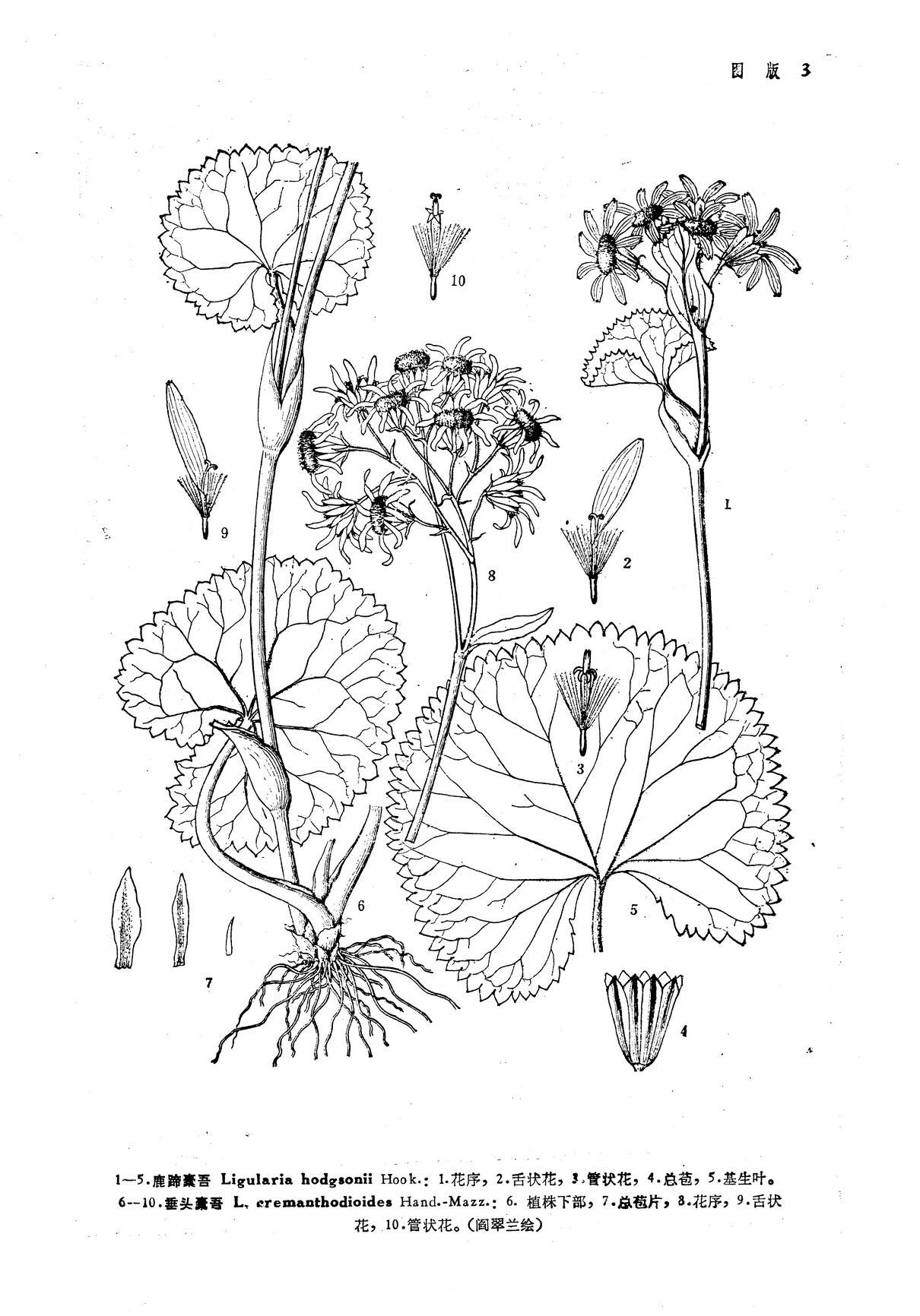 Ligularia hodgsonii Hook. in Curtis’s Bot. Mag. ser. 3, 20: t. 5417. 1863: Henry in Gard. Chron. 3. ser. 32: 218. 1902; Hand.-Mazz. in Bot. Jahrb. 69: 115. 1938; Kitam. in Mem. Coll. Sci. Kyoto Univ. Ser. B. 16: 197. 1942: Pojark. in Fl. URSS 26: 798. 1961; Dress in Baileye 10: 71. 1962: H. Koyama in Acta Phytotax. Geobot. 22: 75. 1966; S. Y. Hu in Quart. Journ. Taiwan Mus. 20: 59. 1967; H. Koyama in Mem. Fac. Sci. Kyoto Univ. Ser. Biol. 2: 46. 1968; 中国高等植物图鉴4: 576.图6566. 1975; Kitam. et al. Colour. Ill. Herb. Pl. Jap. 1: 42. Pl. 13. 91. 1978. ——Senecio yesoensis Franch. in Bull. Soc. Bot. France 39: 306. 1892, incl. var. sutchuerensis Franch. et var. creniferus Franch. ——Ligularia yesoensis (Franch.) Diels in Bot. Jahrb. 29: 622. 1900, incl. var. ——L. hoddsonii var. sutchuenensis (Franch.) Henry, l. c. 3, ser. 32: 218. 1902. ——L. yesoensis var. pulchella Pamp. in hlouv. Giorn. Bot. Ital. n. s. 18: 142. 1911. ——L. hodgsomi var. crenifera (Franch.) Hand.-Mazz. l. c. 69: 115. 1938. ——L. hodgsonii var. pulchella (Ramp.) Hand.-Mazz. l. c. 69: 115. 1938. ——Senecillis hodgsoniia Hook.) Kitam. in Acta. Phytotax. Geobot. 8: 82. 1939. ——Ligularia clivorum uct. non Maxim. : Hand.-Mazz. Symb. Sin. 7: 1132. 1936,
