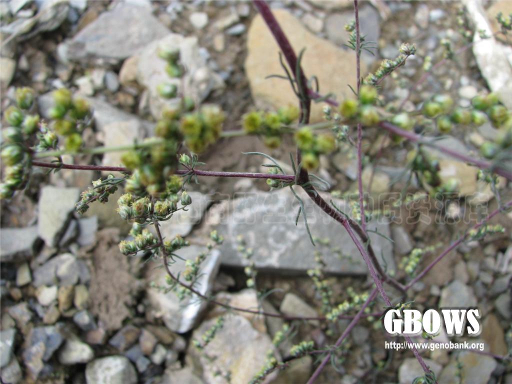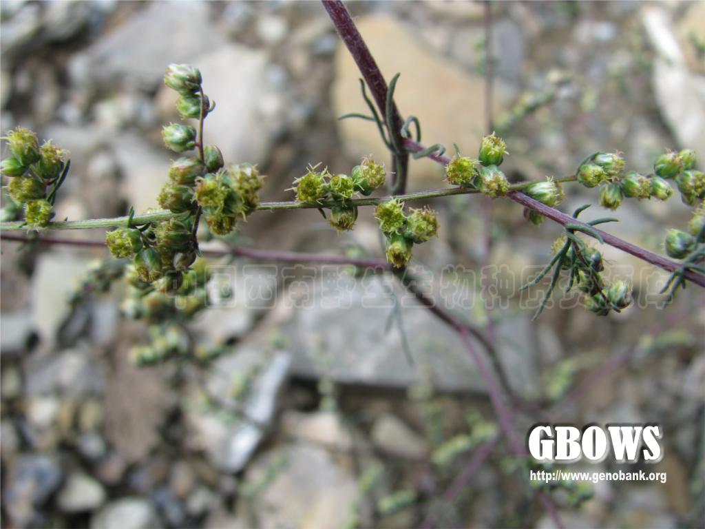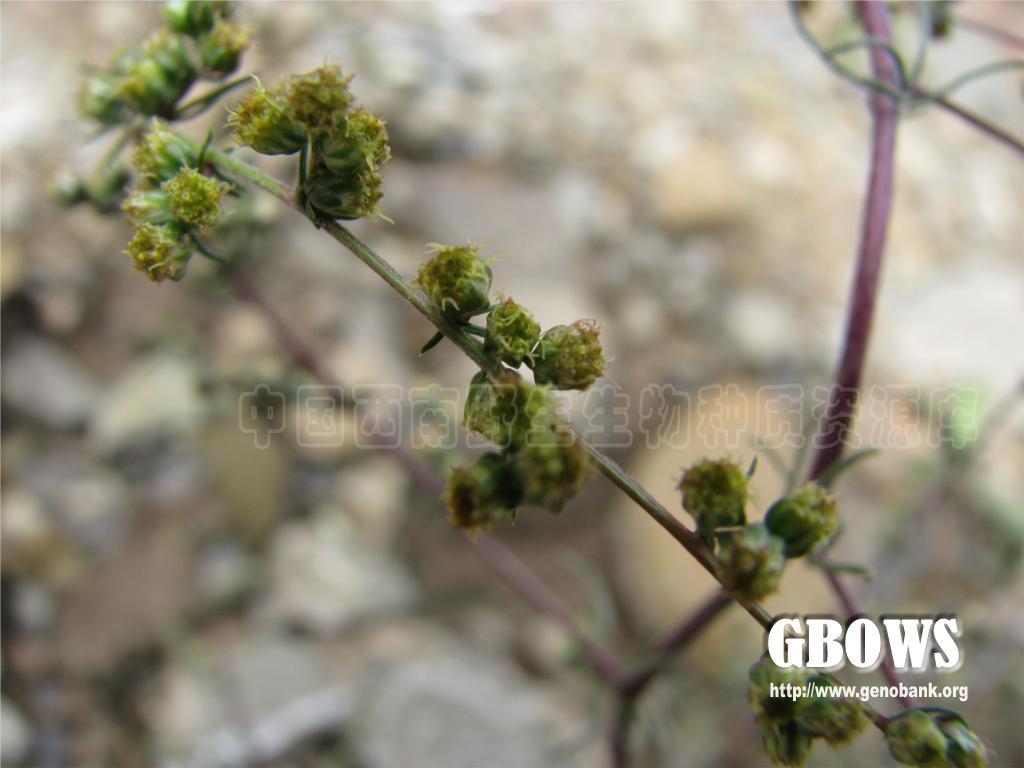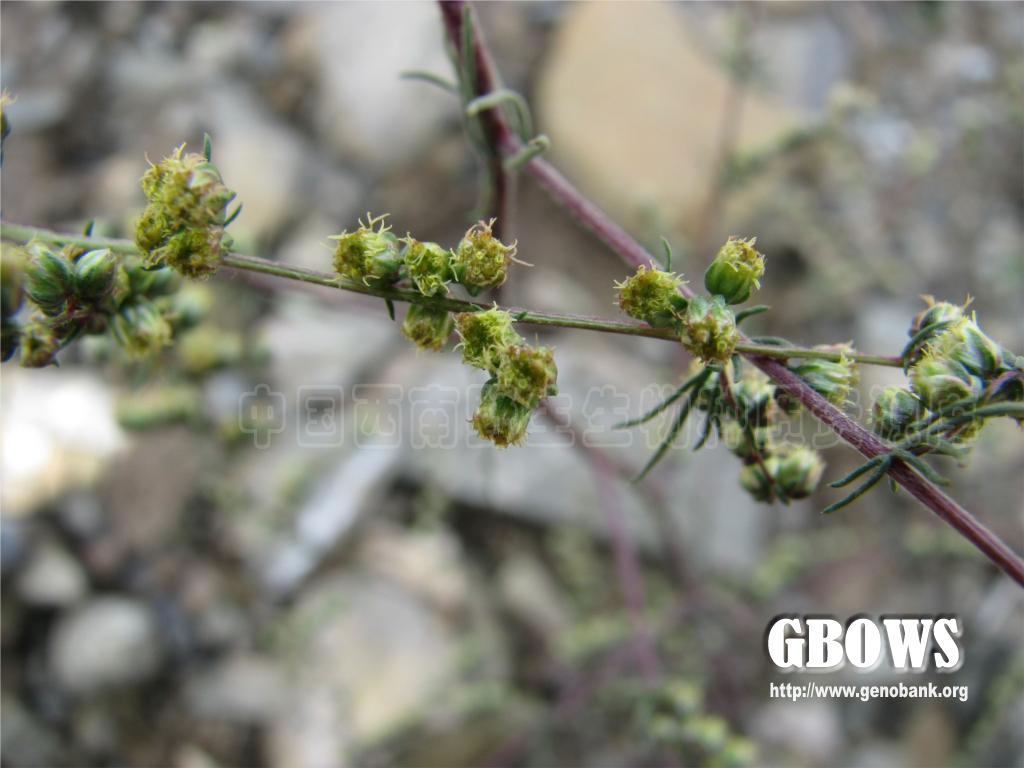 多年生草本或近一、二年生草本;植株有浓烈的香气。主根单一,狭纺锤形、垂直,半木质或木质化;根状茎粗短,直立,半木质或木质,常有细的营养枝,枝上密生叶。茎通常单生,稀2-3枚,高40-90(-130)厘米,红褐色或褐色,有纵纹;常自下部开始分枝,枝长10-20厘米或更长,下部分枝开展,上部枝多斜上展;茎、枝幼时被灰白色或灰黄色绢质柔毛,以后脱落。基生叶与营养枝叶两面被灰白色绢质柔毛。叶近圆形、长卵形,二至三回羽状全裂,具长柄,花期叶凋谢;茎下部叶初时两面密被灰白色或灰黄色略带绢质的短柔毛,后毛脱落,叶长卵形或椭圆形,长1.5-3.5厘米,宽1-3厘米,二至三回羽状全裂,每侧有裂片3-4枚,再次羽状全裂,每侧具小裂片1-2枚,小裂片狭线形,长3-5毫米,宽0.2-1毫米,不再分裂或具1-2枚小裂齿,叶柄长2-4厘米;中部叶初时两面被短柔毛,后脱落,叶长圆形或长卵形,长1-2厘米,宽0.5-1.5厘米,一至二回羽状全裂,每侧具裂片2-3枚,不分裂或再3全裂,小裂片丝线形或为毛发状,长4-8毫米,宽0.2-0.3(-0.5 )毫米,多少弯曲;茎上部叶与分枝上叶及苞片叶3-5 全裂或不分裂。头状花序近球形,稀近卵球形,极多数,直径1-1.5(-2)毫米,具极短梗或无梗,基部有线形的小苞叶,在分枝上偏向外侧生长,并排成复总状或复穗状花序,而在茎上再组成大型、开展的圆锥花序;总苞片3-4层,外层总苞片草质、卵形,背面绿色、无毛,边缘膜质,中、内层总苞片长卵形或椭圆形,半膜质;花序托小,凸起;雌花5一7朵,花冠狭圆锥状或狭管状,冠檐具2裂齿,花柱线形,伸出花冠外,先端2叉,叉端尖;两性花4-10朵,不孕育,花冠管状,花药线形,先端附属物尖,长三角形,花柱短,先端膨大,2裂,不叉开,退化子房不明显。瘦果倒卵形或长圆形,褐色。花果期7-10月。