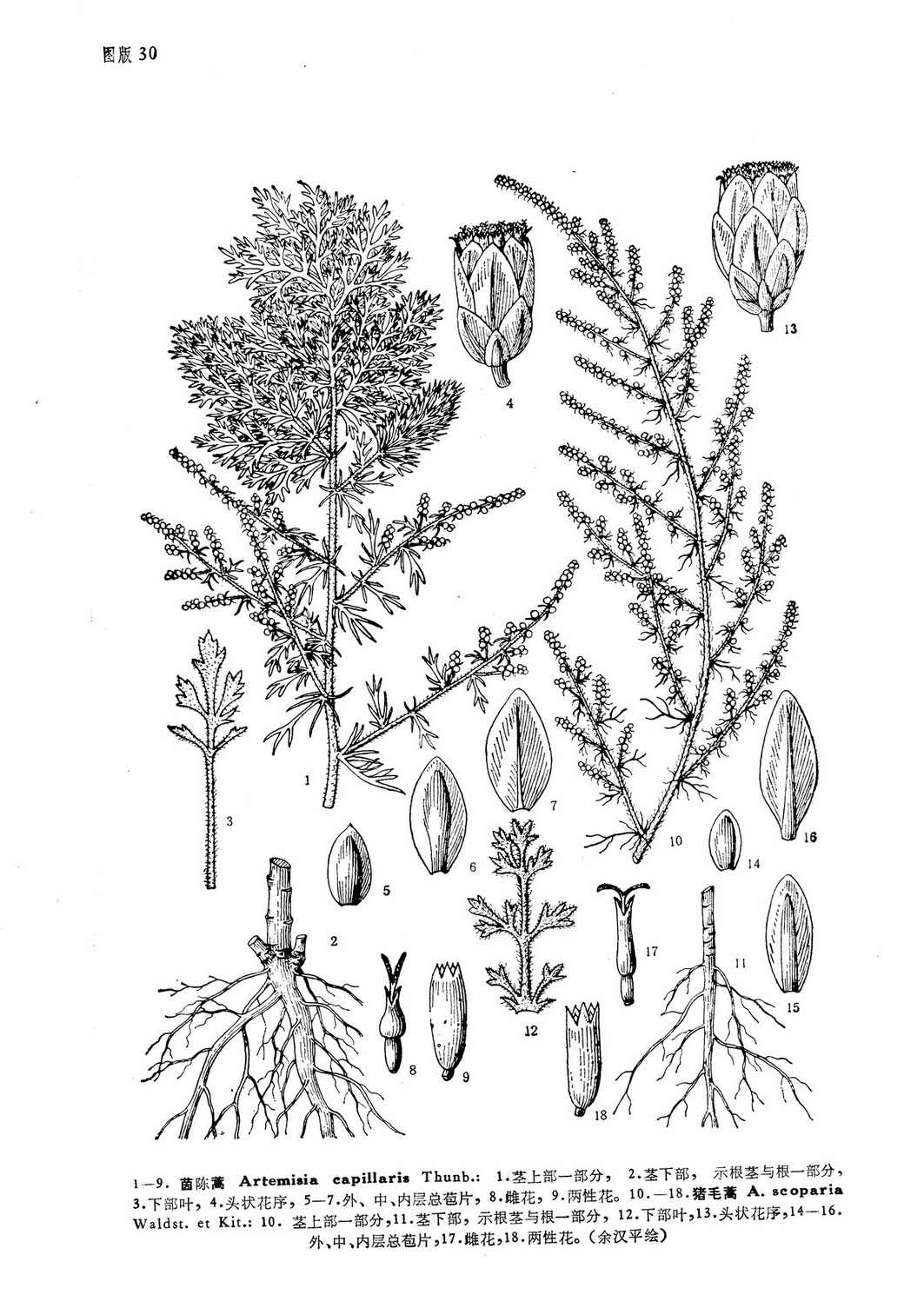 Artemisia scoparia Waldst. et Kit. Pl. rar. Hung. 1: 66, Tab. 65. 1802; Bess. n Bull. Soc. Nat. Mosc. 8: 92. 1835; DC. Prodr. 6: 99. 1837; Ledeb. Fl. Ross. 2(2): 1569. 1844-1846; Maxim, Prim., Fl. Amur. 159. 1859 et in Bull. Acad. Sci. Petersb. 8: 523. 1872; Regel, Tent. Fl. Ussur. 88. 1861; Boiss. Fl. Or. 3: 364. 1875; C. B. Clarke, Comp. Ind: 158. 1876: Hook. f. Fl. Brit. Ind.; 3: 323. 1881; Franch. pl. David. 1: 167. 1884; Forb. et Hemsl. in Journ. Linn. Soc. Bot. 23: 445. 1888; Komar. Fl. Mansh. 3: 651. 1907, incl f. sericea Komar.; Nakai, Fl. Kor. 2: 32. 1911 et Fl. Sylv. Kor. 14: 101. 1923; Komar. et Alis. Key Pl. Far East. Reg. USSR 2: 1035, Tab. 311, fig. 4. 1932; Kitam. in Act. Phytotax. Geobot. 5: 85. 1936, in Mem. Coll. Sci. Kyoto Univ. ser. B. 15(3): 376. 1940, in Trans. Sapp. Nat. Hist. Soc. 16: 61. 1940, 15: 40. 1953, Fl. Afghan. 388. 1960 et Fl. Pl. W. Pakistan 143. 1964; Kitag Lineam. Fl. Mansh. 431. 1939, incl. var. hexeromorpha Kitag.; Ohwi, Fl. Jap. 1190 1956; 东北植物检索表393, 图版135, 图5. 1959, incl. f. villosa Korsh. et var. heteromorpha Kitag.; Poljak. Фл. СССР 26: 560. 1961; S. Y. Hu in Quart. Journ. Taiwan Mus. 18 (3-4): 257 1965, incl. f. sericea Komar.; Filat. Фл Каэах. 9: 114 1966; Noda, Fl. N.-E. Prov. (Manch.) China 1222. 1971; Nasir et Ali, Fl. W. Pakistan 719. 1972; 中国高等植物图鉴4: 523,图6460. 1975; Tutin et al. Fl. Europ 4: 186. 1976;江苏植物志870, 图2188. 1982; 西藏植物志4: 779, 图340. 1985.——A. el egans Roxb. Fl. Ind. 3: 421. 1832. ——A. trichophylla Wall. ex DC. l. c. 6: 100 1837. ——A. kohatica K. W. Klatt, in Sitzung. Akad. Wiss. Muench. 8: 91. 1878——A. sco pariaeformis M. Pop. De scr. Pl. Nov. Turkest, 1: 50 1915. ——A. capillaries Thunb. var. scoparia (Waldst. et Kit.) Pamp. in Nuov. Giorn. Bot. Ital. n. s. 34: 642. 1927, 36: 378 1929. 39: 23. 1932, 46: 557, 1939 et in Act. Hort. Gothob. 6: 68 1930, incl. f. kohatica (Klatt) Pamp. fvillosa Korsh., f. elegans (Roxb.) Pamp., f. myriocephala Pamp. et f. williamsonii Pamp.; Ling in Contr. Inst, Bot. Nat. Acad. Peip, 2 (10): 509 1934; Hand.——Mazz Symb. Sin. 7 (4): 1114. 1936. ——A. capillaries Thunb, var. acaul is Pamp. p. p. l. c. 34: 646. 1927, 6: 68. 1930 et var. grandiflora Pamp in Lav. Inst, Bot. Univ. Cagl. 35: 4 1938, incl. f. genuina Pamp. curia subf. angustisecta Pamp., f. latifolia Pamp. cum subf. tenuifolia Pamp.; Ling l. c. 2(10): 509 1934 et 3: 211. 1935; S. Y. Hu, l. c. 18(1-2): 127. 1965. ——A. capillaris auct., non Thunb. : Miq, in Ann. Muss. Bot. Lugd. -Bat, 2: 175. 1865-1866, excl. var. arbuscula Miq .; 内蒙古植物志6: 118, 图版39, 图10, 11. 1982. Oligosporus scoparius (Waldst. et Kit.) Less. in Linnaea 9: 191. 1834. Poljak. В Мат. Фл. Раст. Каэах. 11: 167., 1961; Czerep. Add. Corr. Fl. URSS (1-30) , 90. 1973.