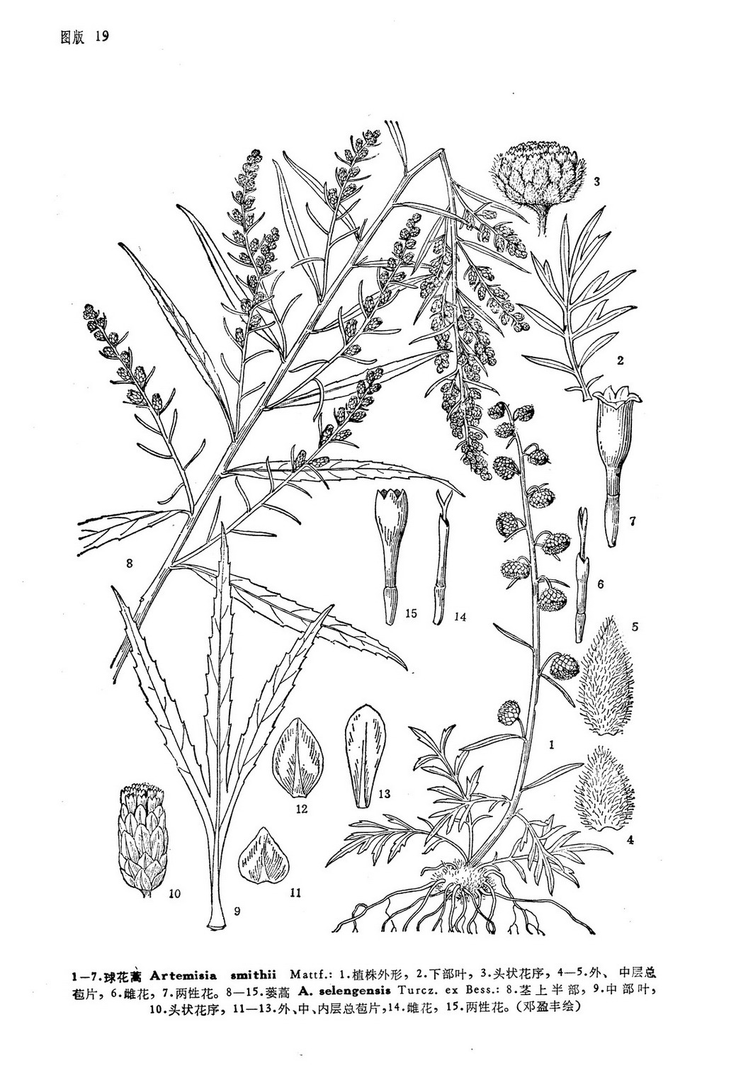 多年生草本;植株具清香气味。主根不明显或稍明显,具多数侧根与纤维状须根;很状茎稍粗,直立或斜向上,直径4-10毫米,有匍匐地下茎。茎少数或单,高60-150厘米,初时绿褐色,后为紫红色,无毛,有明显纵棱,下部通常半木质化,上部有着生头状花序的分枝,枝长6-10(-12)厘米,稀更长,斜向上。叶纸质或薄纸质,上面绿色,无毛或近 无毛,背面密被灰白色蛛丝状平贴的绵毛;茎下部叶宽卵形或卵形,长8-12厘米,宽6-10厘米,近成掌状或指状,5或3全裂或深裂,稀间有7裂或不分裂的叶,分裂叶的裂片线形或线状披针形,长5-7(-8)厘米,宽3-5毫米,不分裂的叶片为长椭圆形、椭圆状披针形或线状披针形,长6-12厘米,宽5-20毫米,先端锐尖,边缘通常具细锯齿,偶有少数短裂齿白,叶基部渐狭成柄,叶柄长0.5-2(-5)厘米,无假托叶,花期下部叶通常凋谢;中部叶近成掌状,5深裂或为指状3深裂,稀间有不分裂之叶,分裂叶之裂片长椭圆形、椭圆状披针形或线状披针形,长3-5厘米,宽2.5-4毫米,不分裂之叶为椭圆形、长椭圆形或椭圆状披针形,宽可达1.5 厘米,先端通常锐尖,叶缘或裂片边缘有锯齿,基部楔形,渐狭成柄状;上部叶与苞片叶指状3深裂,2裂或不分裂,裂片或不分裂的苞片叶为线状披针形,边缘具疏锯齿。头状花序多数,长圆形或宽卵形,直径2-2.5毫米,近无梗,直立或稍倾斜,在分枝上排成密穗状花序,并在茎上组成狭而伸长的圆锥花序;总苞片3-4层,外层总苞片略短,卵形或近圆形,背面初时疏被灰白色蛛丝状短绵毛,后渐脱落,边狭膜质,中、内层总苞片略长,长卵形或卵状匙形,黄褐色,背面初时微被蛛丝状绵毛,后脱落无毛,边宽膜质或全为半膜质;花序托小,凸起;雌花8-12朵,花冠狭管状,檐部具一浅裂,花柱细长,伸出花冠外甚长,先端长,2叉,叉端尖;两性花10-15朵,花冠管状,花药线形,先端附属物尖,长三角形,基部圆钝或微尖,花柱与花冠近等长,先端微叉开,叉端截形,有睫毛。瘦果卵形,略扁,上端偶有不对称的花冠着生面。花果期7-10月。