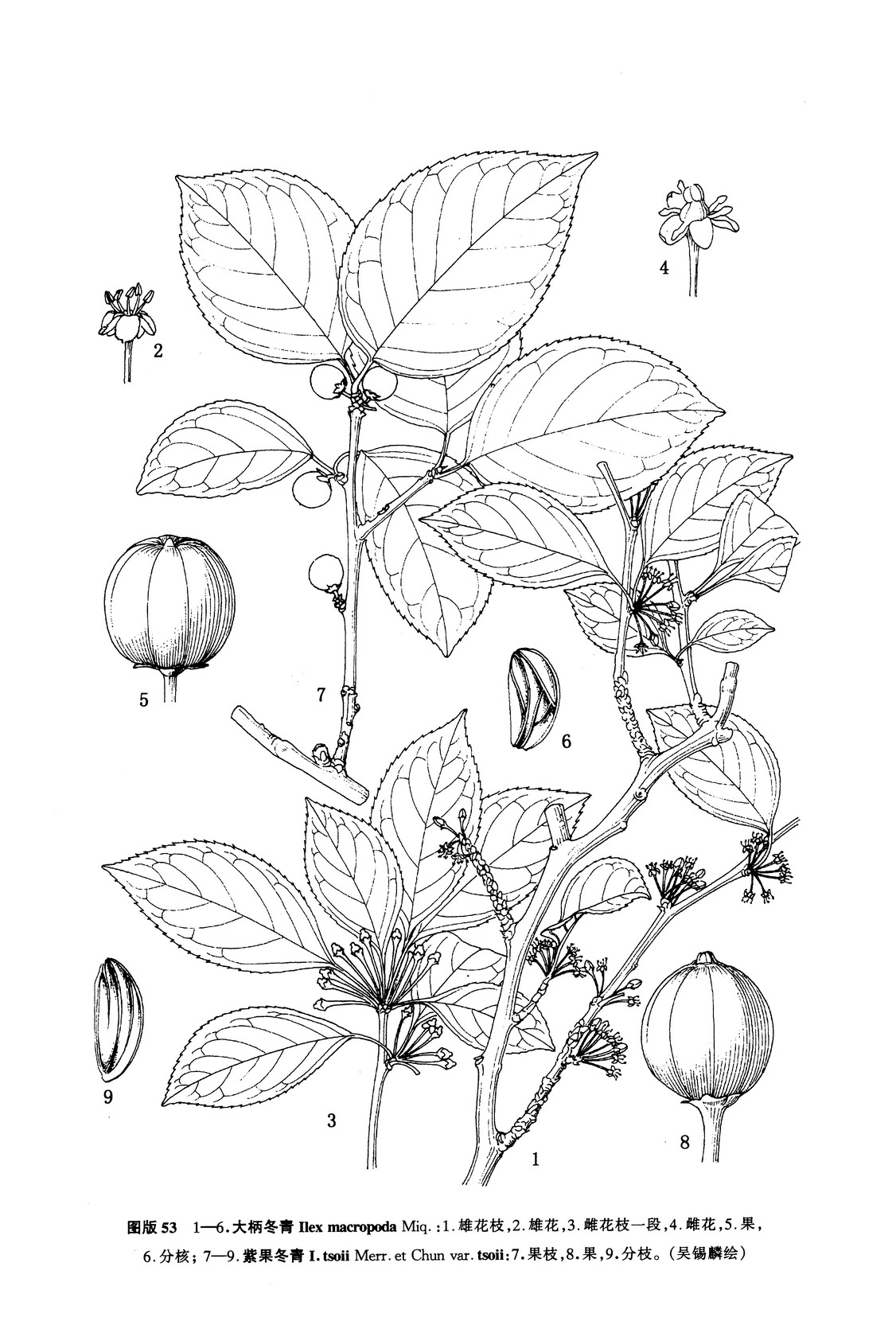 Ilex macropoda Miq. in Ann. Mus. Bot. Lugd.-Bat. 3: 105. 1867; Franch. et Sav. Enum. Pl. Jap. 1: 77. 1873; Maxim. in Mem. Acad. Sci. Petersb. VII, 29: 30, 51. pl. 1, fig. 8. 1881; Hara in Bot. Mag. (Tokyo) 50: 187. 1936; S. Y. Hu in Journ. Arn. Arb. 30 (3) : 279. 1949;中国高等植物图鉴2: 643,图3016. 1972; J. Ohwi, Fl. Japan 849. 1978;安徽植物志3: 354,图1344. 1988; 河南植物志2: 509.图1431. 1988; 浙江植物志4: 5, 图4-5. 1993; 湖北植物大全282. 1993. ——Ilex costata Bl. ex Miq. Cat. Mus. Bot. Lugd.-Bat. 167. 1870, nom. nud.; Maxim. 1. c. 51. 1881. ——I. dubia (G. Don.) Trel. var. macropoda (Miq.) Loes. in Nov. Acta Acad. Caes. Leop.-Carol. Nat. Cur. 78: 487 (Monog. Aquif. 1: 487) . 1901. ——I. dubia (G. Don) Trel. var. hupehensis Loes. 1. c. 488. 1901, in Part.——I. dubia (G. Don) Britton, Stern et Pogg. var. pseudo-macropoda Loes. in Sarg. Pl. Wils. 1: 82. 1911; Rehd. in Journ. Arn. Arb. 8: 158. 1927; Chien in Contr. Biol. Lab. Sci. Soc. China 3 (1) : 58: 1927; ——I. montana Torr. et Gray var. macropoda (Miq.) Fern. in Rhodora 41: 428. 1933.