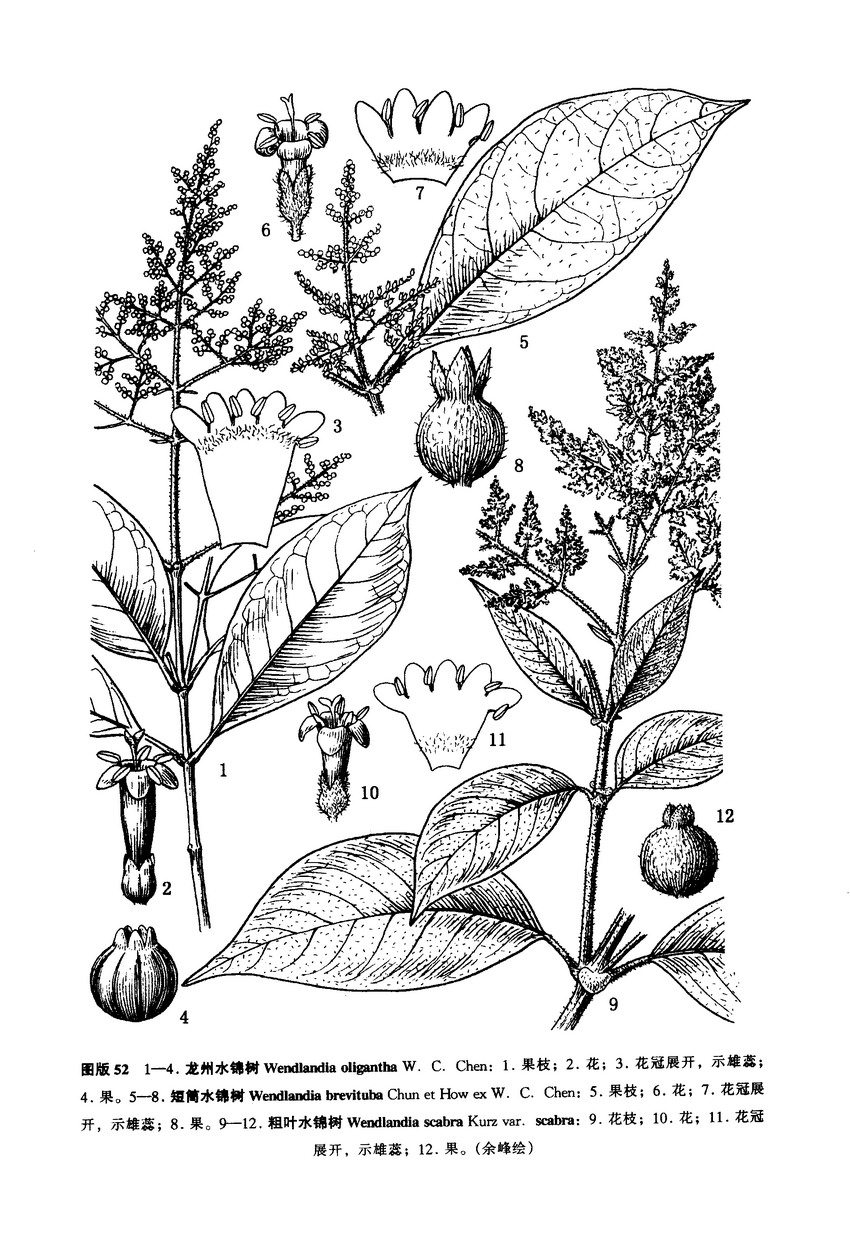灌木或乔木,高1-12米;枝被棕褐色短柔毛。叶纸质或革质,椭圆状倒卵形、椭圆形或卵形,长6.5-18厘米,宽2.8-9厘米,顶端短尖或渐尖,尖头常稍钝,基部楔形或短尖,稀钝圆,上面稍粗糙,被短糙伏毛,脉上有疏短柔毛,下面密被柔毛,极少较疏,脉上更密;侧脉6-10对,在下面凸起;叶柄长0.5-2.7厘米,被棕褐色短柔毛;托叶圆形,反折,与小枝等宽或近等宽。花序顶生,大而扩展,长可达30厘米,宽可达25厘米,密被棕褐色绒毛;花香,无花梗或具短花梗,密生;花萼长1.5-1.75毫米,被长硬毛,萼裂片三角形,长0.5-0.75毫米,比萼管短;花冠白色,长3.5-4.5毫米,外面无毛,冠管内面仅下部有极疏的短柔毛或无毛,裂片长圆形,长1-1.25毫米,比冠管短;花丝很短,花药椭圆形,长0.75-1毫米;花柱和柱头长3.5-4.7毫米,无毛,柱头2裂,长约0.7毫米,伸出。蒴果球形,被硬毛,直径约2毫米。
