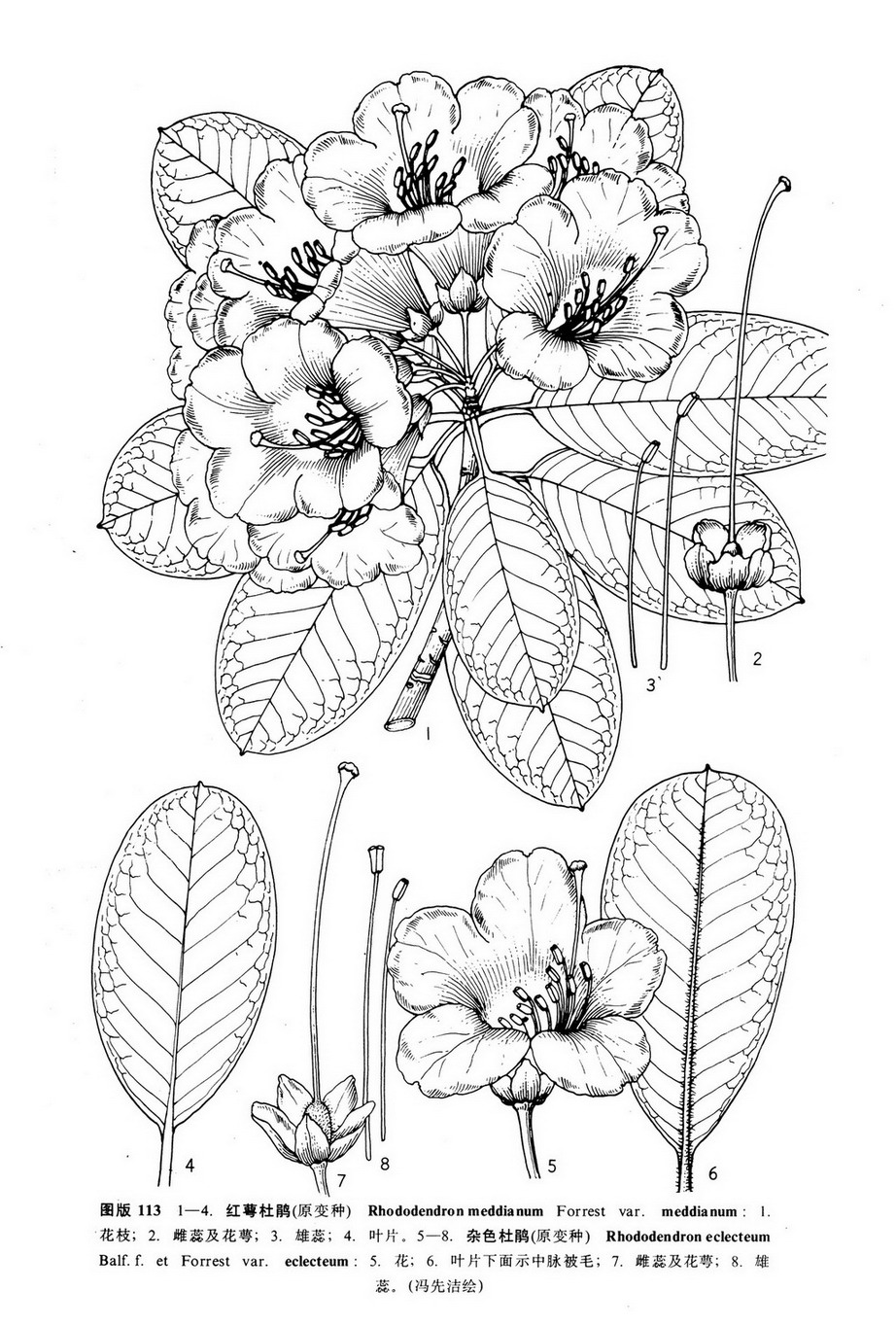 树皮层状剥落。叶常4-6枚密生于枝顶,革质,倒卵形或近于圆形,长5-12厘米,宽2.5-5厘米,先端钝圆形或有小尖头,基部楔形,两侧稍下延于宽而扁平的叶柄上,上面深绿色,无毛,下面淡绿色,沿中脉两侧有白色柔毛,中脉在上面平坦,在下面隆起,侧脉9-12对,在两面均平坦,微现;叶柄短,扁平,长约5-15毫米,无毛。总状伞形花序,有花5-10朵,总轴长5-12毫米,无毛;花梗长1-2厘米,无毛;花萼较大,杯状,长7-10毫米,5裂,裂片大小不等,无毛;花冠管状钟形,长3.5-5厘米,蔷薇色、白色至淡黄色,有深色斑点,5裂,裂片半圆形,长1.5厘米,宽2厘米,有凹缺;雄蕊10,长1.8-3厘米,不等长,花丝线形,基部较宽,有短绒毛,花药卵圆形,长2-3毫米;子房圆柱状,长约5毫米,密被腺体,花柱长约3厘米,无毛,柱头微膨大。蒴果圆柱状,长1.2厘米,直径6毫米,成熟后5裂,花萼宿存。花期5-6月,果期8-10月。
