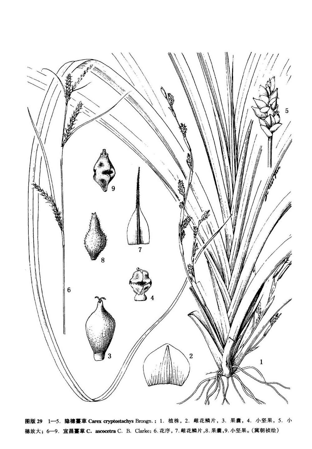 Carex cryptostachys Brongn in Duperrey, Voy. Coquille Bot. 152, t. 25, 1828; Kukenth. in Engl., Pflanzenr. Heft 38 (IV, 20): 471, 1909; Raymond in Mem. Jard. Bot. Montreal 53: 61, 1959; 中国高等植物图鉴5: 302, 图7433, 1976; 海南植物志4: 340, 1977; 台湾植物志5: 324, pl. 1353, 1978; Kern et Nooteboom in van Steenis, Fl. Males. ser. I, 9 (1): 148, fig 120, 1979; 福建植物志6: 358, 图322, 1995.