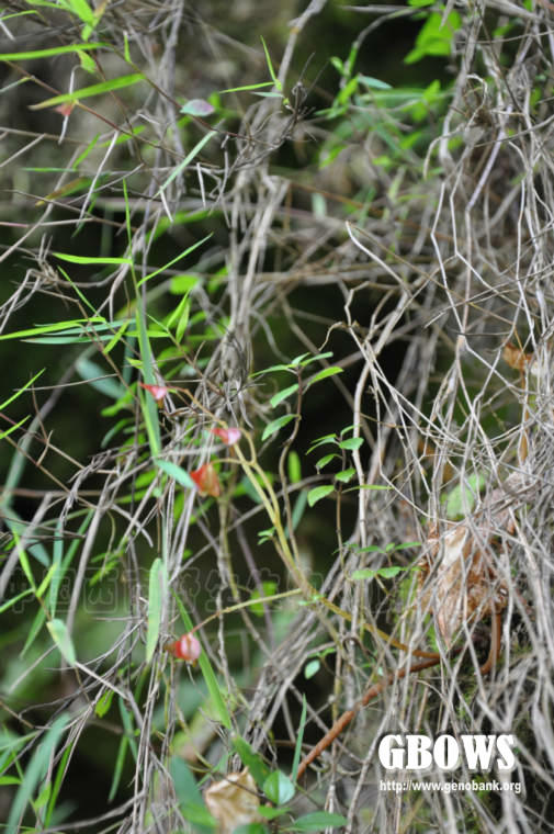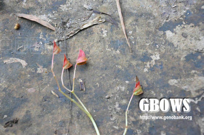 多年生具茎草本。根状茎似球状膨大但未形成球形,周围生有多数细长纤维根。茎高14-40厘米,柔弱,有纵棱,无毛,节疏,在基部1-2节常铺地生根。基生叶未见。茎生叶多数,互生,具长柄;叶片两侧极不相等,轮廓斜三角形,长3.5-8厘米,宽2.5-5厘米,先端长渐尖,基部极偏斜,呈浅心形,窄侧圆形,宽侧下延长1-2厘米,呈宽圆耳形,边缘中部以下呈宽三角形之齿,中部以上呈斜三角形之齿,齿尖有短芒,上面深绿色,下面淡绿色,两面均无毛,掌状5-7条脉,窄侧2条,宽侧3-4条;叶柄长1.8-5.5厘米,有棱,无毛;托叶膜质;卵形,长5-7毫米,先端渐尖,顶端有芒,边有缘毛。花粉红色,在腋生者通常2朵,着生于花序梗上,短于叶柄,顶生的花较多,二朵成束,排成较长的总状;花梗长6-10毫米,细弱,花序梗和花梗均无毛;苞片卵形,长6-7毫米,先端渐尖,顶端带芒,上部有缘毛;雄花:花被片4,外轮2枚宽卵形,长5-7毫米,宽约4.5毫米,先端圆钝,近无毛,内轮2枚长椭圆形,长约3毫米,宽约1毫米,先端圆;雄蕊多数,花丝长约1毫米,基部合生,花药长椭圆形,长约1.2毫米,先端尖;雌花:花被片4,外轮2枚宽卵形,长7-8毫米,宽6-7毫米,先端钝或尖,外面无毛,内轮2枚,长椭圆形,长6-7毫米,宽约1.5毫米,先端钝;子房长椭圆形,长6-7毫米,宽2-3毫米,无毛,3室,中轴胎座,每室胎座具2裂片,花柱3,基部合生,柱头2裂,螺旋状扭曲呈头状或盘状并带刺状突头。蒴果下垂,果梗长1.5-1.7厘米,细弱,无毛;轮廓长椭圆形,长约10毫米,直径6毫米,无毛;具不等3翅,1翅大,呈斜三角形,长约1.5厘米,基部宽1.3厘米,中部宽1厘米,靠近顶端宽4毫米,上方的面平,下方的面从下向上斜,有明显网脉,无毛,另2翅窄,近等大;种子极多数,小,长圆形,淡褐色,无毛。花期8月,果期9月开始。
