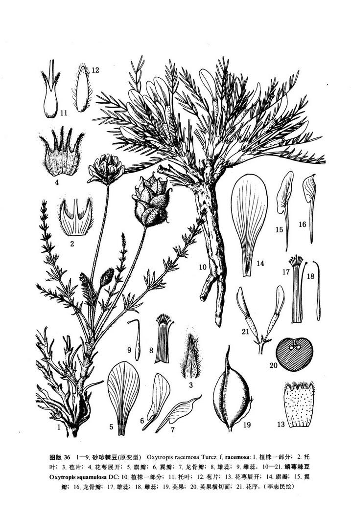多年生草本,高5-15 (-30) 厘米。根淡褐色,圆柱形,较长。茎缩短,多头。轮生羽状复叶长5-14厘米;托叶膜质,卵形,大部与叶柄贴生,分离部分先端尖,被柔毛;叶柄与叶轴上面有细沟纹。密被长柔毛;小叶轮生,6-12轮,每轮4-6片,或有时为2小叶对生,长圆形、线形或披针形,长5-10毫米,宽1-2毫米,先端尖,基部楔形,边缘有时内卷,两面密被贴伏长柔毛。顶生头形总状花序;总花梗长6-15厘米,被微卷曲绒毛;苞片披针形,比花萼短而宿存;花长8-12毫米;花萼管状钟形,长5-7毫米,萼齿线形,长1.5-3毫米,被短柔毛;花冠红紫色或淡紫红色,旗瓣匙形,长12毫米,先端圆或微凹,基部渐狭成瓣柄,冀瓣卵状长圆形,长11毫米,龙骨瓣长9.5毫米,喙长2-2.5毫米;子房微被毛或无毛,花柱先端弯曲。荚果膜质,卵状球形,膨胀,长约10毫米,先端具钩状短喙,腹缝线内凹,被短柔毛,隔膜宽约0.5毫米,不完全2室。种子肾状圆形,长约1毫米,暗褐色。花期5-7月,果期6-10月。