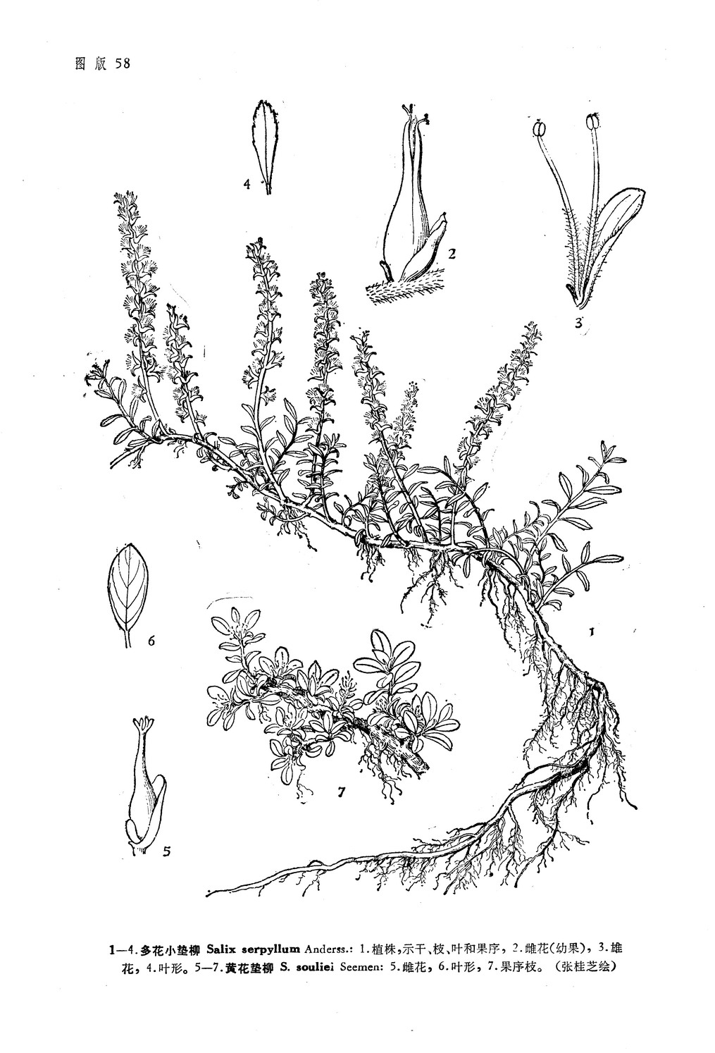 Salix serpyllum Anderss. in Journ. Linn. Soc. 4: 55. 1860; DC. Prodr. 16 (2): 290.1868; Hook. f. Fl. Brit. Ind. 5: 634. 1888; Brandis, Ind. Trees. 638. 1906; 西藏植物名录, 48. 1980.——S. brachista Schneid. var. multiflora C. Wang et P. Y. Fu,植物分类学报, 12 (2): 192. 图版49: 3. 1974——S. chumulamanica C. Wang et P. Y. Fu,同上193. 图版49: 4. 1974.——S. nelamunensis C. Wang et P.Y. Fu,同上201. 图版52: 4. 1974.