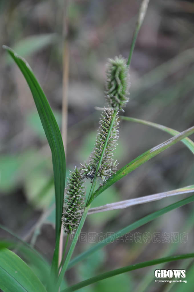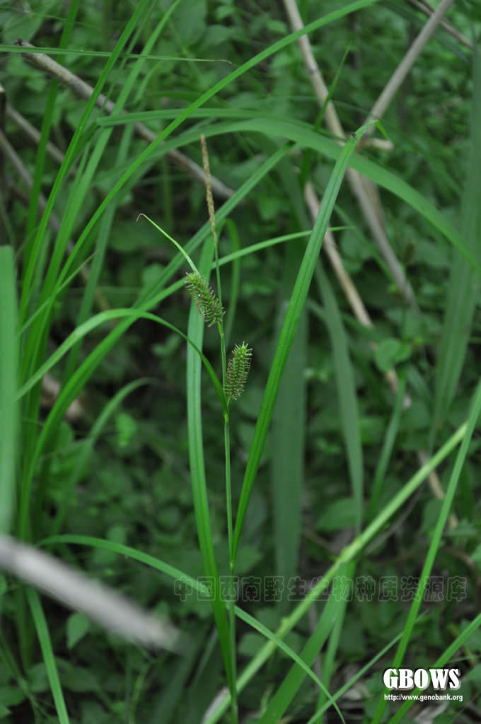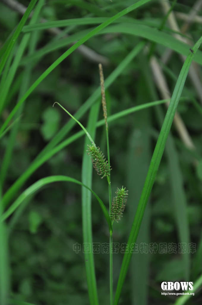 根状茎长而粗壮。秆疏丛生,高35-100厘米,锐三棱形,较粗壮坚挺,平滑,基部具红褐色无叶片的鞘,老叶鞘常撕裂成纤维状和网状。叶短于秆,宽3-4毫米,平张,边缘粗糙,稍外卷,具小横隔脉,具较长的叶鞘,下部的叶鞘被疏的短柔毛,上部的叶鞘无毛或有时被很少毛。苞片下部的叶状,稍短于或近等长于花序,具稍长的鞘,上部的呈刚毛状,具很短的鞘。小穗4-6个,上面的间距较短,下面的间距稍长,顶端2-3个为雄小穗,条形或狭披针形,长2-4厘米,近于无柄;其余为雌小穗,长圆状圆柱形,长3-5厘米,具多数稍疏生的花,有时基部花较稀疏,具短柄。雄花鳞片披针形,顶端渐尖成芒,膜质,淡锈色,中间具3条脉;雌花鳞片卵状披针形或披针形,长约6-8毫米(包括芒长),顶端渐尖成芒,膜质,两侧淡锈色,中间具3条脉,色浅。果囊斜展,长于鳞片,长圆状披针形,稍鼓胀三棱形,长8-10毫米,革质,初时为淡绿色,成熟时麦秆黄色,具多条明显的脉,无毛,基部钝圆,具很短的柄,顶端渐狭成短喙,喙口深裂成两齿,背面裂口较腹面深且呈半圆形,齿长约1毫米。小坚果疏松地包于果囊内,宽卵形,三棱形,长约3毫米,基部具短柄,顶端具短尖;花柱基部不增粗,有时弯曲,柱头3个。花果期6-7月。