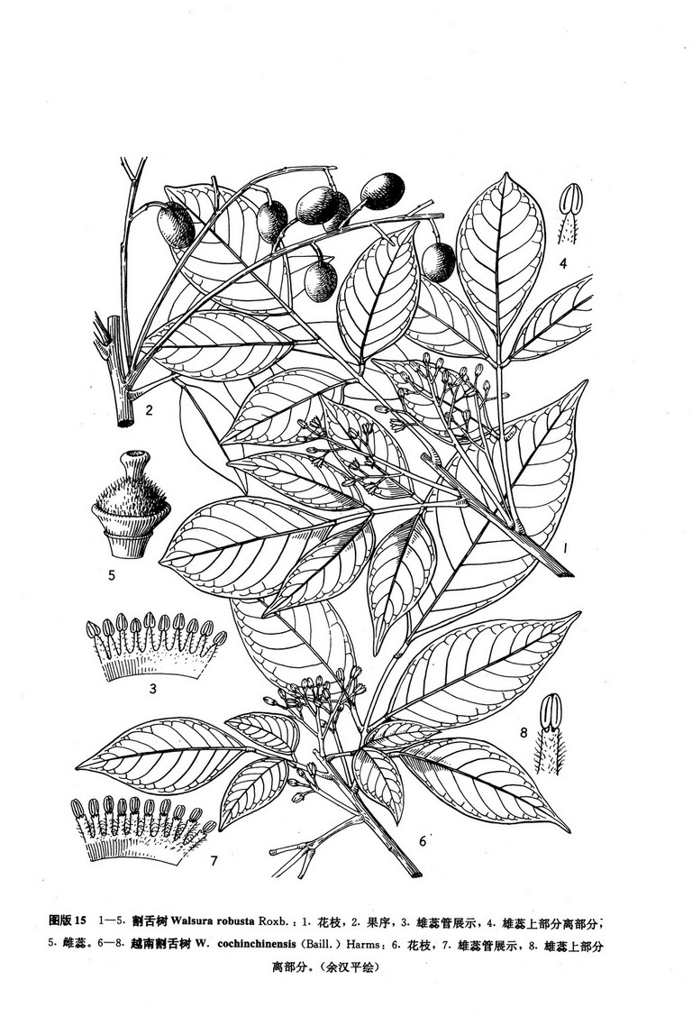 Walsura robusta Roxb. Hort. Beng. 32. 1814, nom. nud. , et Fl. Ind. ed. 2, 2: 386. 1832, dencr.; Hiern in Hook. f. Fl. Brit. Ind. 1:565. 1875, C. DC. Monogr. Phan. 1: 638. 1878; Harms in Engl. u Prantl, Nat. Pflanzenfam. 3 (4): 302, fig. 163, A1-B1. 1897, et ed. 2. 19b (1): 118, fig. 31. A1-D1. 1940; Pellegr. in Lecomte, Fl. Gen. Indo-Chine 1: 785. 1911. Merr. in Lingn. Sci. Journ. 14; 20. 1935; 侯宽昭、陈德昭, 植物分类学报4:35. 1955; 海南植物志3: 71, 图575. 1974; 云南植物志1: 226, 图版53: 5-8. 1977; 云南种子植物名录, 上册835. 1984; 广东植物志2: 299, 图194. 1991.