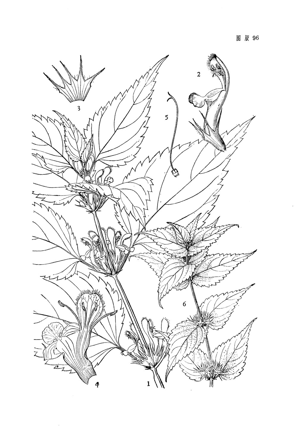 多年生植物;根茎有长地下匍匐枝。茎高达1米,单生,直立,四棱形,具浅槽,中空,几无毛。茎下部的叶卵圆形或心脏形,长4.5-8.5厘米,宽3.5-5厘米,先端尾状渐尖,基部心形,茎上部的叶卵圆状披针形,较茎下部的叶为长而狭,先端长尾状渐尖,边缘有微内弯的牙齿状锯齿,齿尖具胼胝体的小突尖,草质,两面均被短硬毛,叶柄长达7厘米,茎上部的渐变短。轮伞花序4-14花,着生于茎端;苞片狭线形或丝状,长2-3毫米,锐尖,具缘毛。花萼钟形,长约1.5厘米,宽约4毫米,外面疏被伏毛,膜质,萼齿披针状钻形,长7-10毫米,具缘毛。花冠白或浅黄色,长约2厘米,冠筒基部直径2毫米,稍上方呈囊状膨大,筒口宽至6毫米,外面在上部被疏硬毛或近绒毛状毛被,余部几无毛,内面冠筒近基部有毛环,冠檐二唇形,上唇直立,倒卵圆形或长圆形,长约1.2厘米,先端圆形或微缺,边缘具缘毛及长柔毛,下唇长约6毫米,3裂,中裂片倒肾形,先端深凹,基部急收缩,侧裂片宽,浅圆裂片状,长约0.5毫米,先端有针状小齿。雄蕊花丝扁平,被微柔毛,彼此粘连,花药深紫色,被柔毛。花柱丝状,先端近相等的2浅裂。花盘杯状。子房裂片长圆形,无毛。小坚果倒卵圆形,先端截形,基部渐狭,长约3毫米,直径1.8毫米,淡褐色。花期4-6月,果期7-8月。
