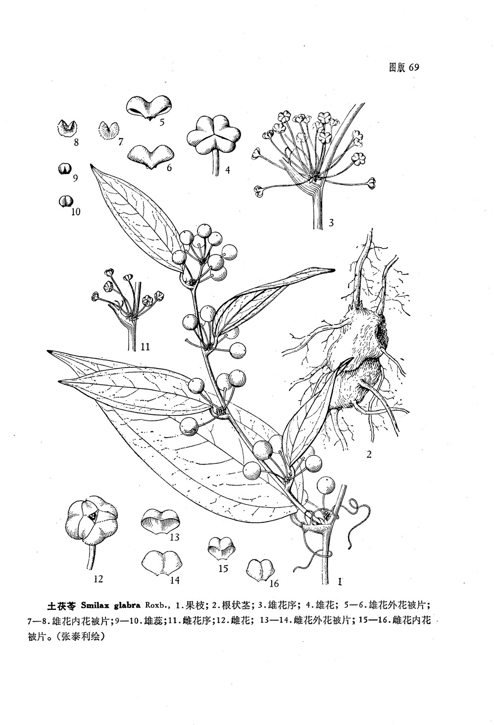 本种粗厚的根状茎入药,称土茯苓,性甘平,利湿热解毒,健脾胃,且富含淀粉,可