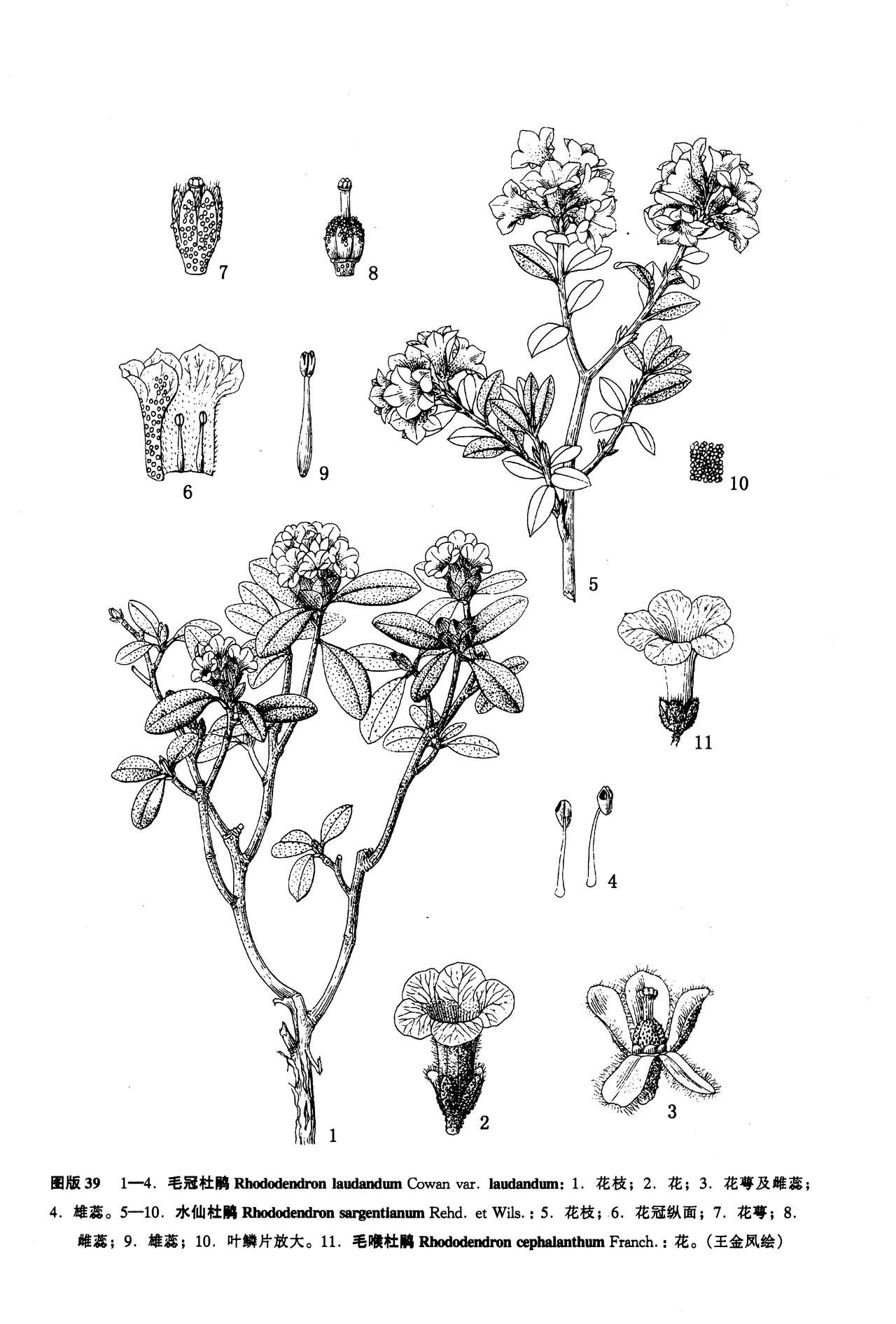 常绿小灌木,高(15-)300(-120)厘米。小枝细长挺直,淡黄色,被鳞片及小刚毛;叶芽鳞常早落。叶革质,芳香,长圆状卵形、椭圆形、卵形或近圆形,长0.9-1.8厘米,宽0.4-1厘米,先端圆或钝,有小短尖头,基部圆或宽楔形,上面暗绿色或带褐色,幼时被疏鳞片,成熟后脱落,下面密被暗红褐色、撕裂状的鳞片,鳞片因其柄的长短不一而形成重叠的2-3层;叶柄长2-4毫米。花序顶生头状,有花5-10朵,花芽鳞宿存;花梗长3-6毫米,密被鳞片,疏被毛;花萼红带绿色,5深裂,裂片不等大,长4-6毫米,长超过花管的1/2,长圆形至倒卵状,外面密被鳞片,边缘密被缘毛;花冠狭筒状,长0.8-1.8厘米,粉色或几白色,罕为乳黄色,外面无鳞片,花管长4.5-11.5毫米,较裂片长,外面被疏至密的柔毛,内面密被柔毛;雄蕊5或6,不等长,长3-5毫米,内藏于花管,花丝光滑;子房长1-2毫米,5室,被鳞片,全部或下半部密被毛,花柱粗壮,常短于子房。蒴果卵球形,长2-4毫米,被鳞片,有或无毛,被包于宿存的萼内。花果期5-7月。