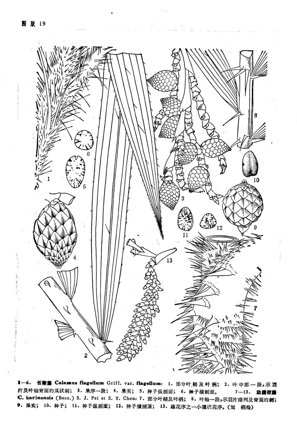 攀援藤本,丛生,带鞘茎粗4-5厘米,裸茎粗2-3厘米。叶羽状全裂,长约2.5米,顶端无纤鞭;羽片等距或近等距排列,阔剑形,长65-80厘米,宽3.5-5.5厘米,中脉粗壮,两面及边缘被刺状刚毛;叶轴背面中央具l列单生的爪状刺;叶柄粗壮;托叶鞘凋存;叶鞘上被极不相等的密集单生或有时合生的薄片状渐尖的近成横列的刺,叶鞘及其上面的刺、叶柄及叶轴上多少被鳞秕。雌雄花序同型或异型,长达4-5米或更长,二回分枝(雄花序基部有部分三回分枝),顶端具长的爪状鞭卜;一级佛焰苞长管状,多少具爪状刺,纵裂并在顶端撕裂成纤维状,有几个分枝花序,长70-80厘米,每侧有3-4个小穗状花序,二级佛焰苞狭管状漏斗形,斜截,一侧延伸为三角形的尖并成撕裂状;小穗状花序长10-25厘米(雌的稍长),之字形曲折,每侧有15朵花;小佛焰苞为不对称的宽漏斗形(雄的)或漏斗形(雌的);雄花总苞杯状,稍短于各自的小佛焰苞;雄花长8-10毫米,宽3毫米,外弯并半伸出于小佛焰苞;花萼裂至中部成3裂;花冠不及花萼的2倍长,几全裂成3裂片;雌花的总苞托为单侧杯状,几乎伸出于小佛焰苞;总苞杯状,几乎全陷入总苞托中;中性花的小窠明显半月形;雌花圆锥状卵形,急尖,长约7毫米;花萼卵形,短3齿裂;花冠披针形,急尖,稍长于花萼。果被扁平;果实卵球形,长3-3.8厘米,直径2-2.2厘米,基部稍圆,具急尖的短喙,嶙片12纵列,中央有沟槽,有不明显的草黄色或暗色的内缘线,边缘啮蚀状。种子卵球形,长2-2.2厘米,直径1.3厘米,基部稍圆,顶端钝,横断面近圆形,表面有细洼点,合点孔穴浅而不明显,胚乳深嚼烂状,胚基生。花期5-6月,果期12-1月。