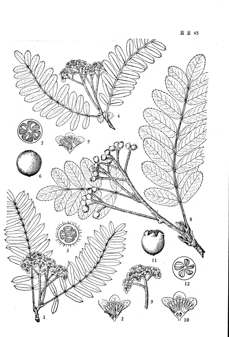 灌木,高4-7米;小枝圆柱形,褐色或黑褐色,具少数皮孔;冬芽扁卵形,先端急尖,有数枚深褐色鳞片,幼时外面微具绒毛,老时脱落。奇数羽状复叶,连叶柄共长6-13厘米,叶柄长1-1.5厘米;小叶片9-14对,间隔6-8毫米,顶端和基部的小叶片渐小,卵状带形或带状长圆形,长15-28毫米,宽6-8毫米,先端圆钝或急尖,基部圆形,边缘大部分全缘,仅先端每侧有4-10细锐锯齿,上面深绿色,光滑,下面色较浅,密被乳头状突起,并在中脉上有锈褐色柔毛;叶轴有锈褐色柔毛,上面具浅沟;托叶卵形,草质,有深裂尖锐锯齿。复伞房花序具多数稀疏排列的花朵,总花梗和花梗有锈褐色柔毛;花梗长3-5毫米;萼筒钟状,老时内外两面均无毛;萼片宽三角形,先端稍钝或急尖,内外两面无毛;花瓣宽卵形或椭圆卵形,长约3毫米,宽2.5-3毫米,先端圆钝,白色,无毛;雄蕊20,比花瓣短;花柱3-5,几与雄蕊等长,基部有柔毛。果实卵形,直径6-8毫米。浅红色,先端具宿存闭合萼片。花期6月,果期8-9月。