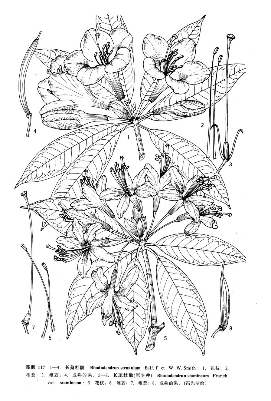 常绿灌木或小乔木,高约3-7米;幼枝纤细,无毛。叶常轮生枝顶,革质,椭圆形或长圆状披针形,长6.5-8厘米,稀达10厘米以上,宽2-3.5厘米,先端渐尖或斜渐尖,基部楔形,边缘微反卷,上面深绿色,具光泽,下面苍白绿色,两面无毛,稀干时具白粉,中脉在上面凹陷,下面凸出,侧脉不明显;叶柄长8-12毫米,无毛。花芽圆锥状,鳞片卵形,覆瓦状排列,仅边缘和先端被柔毛。花常3-5朵簇生枝顶叶腋;花梗长2-2.5厘米,无毛;花萼小,微5裂,裂片三角形;花冠白色,有时蔷薇色,漏斗形,长3-3.3厘米,5深裂,裂片倒卵形或长圆状倒卵形,长2-2.5厘米,上方裂片内侧具黄色斑点,花冠管筒状,长1.3厘米,向基部渐狭;雄蕊10,细长,伸出于花冠外很长,花丝下部被微柔毛或近于无毛;子房圆柱形,长4毫米,无毛,花柱长4-5厘米,超过雄蕊,无毛,柱头头状。蒴果圆柱形,长2-3(-4)厘米,微拱弯,具7条纵肋,先端渐尖,无毛。花期4-5月,果期7-10月。