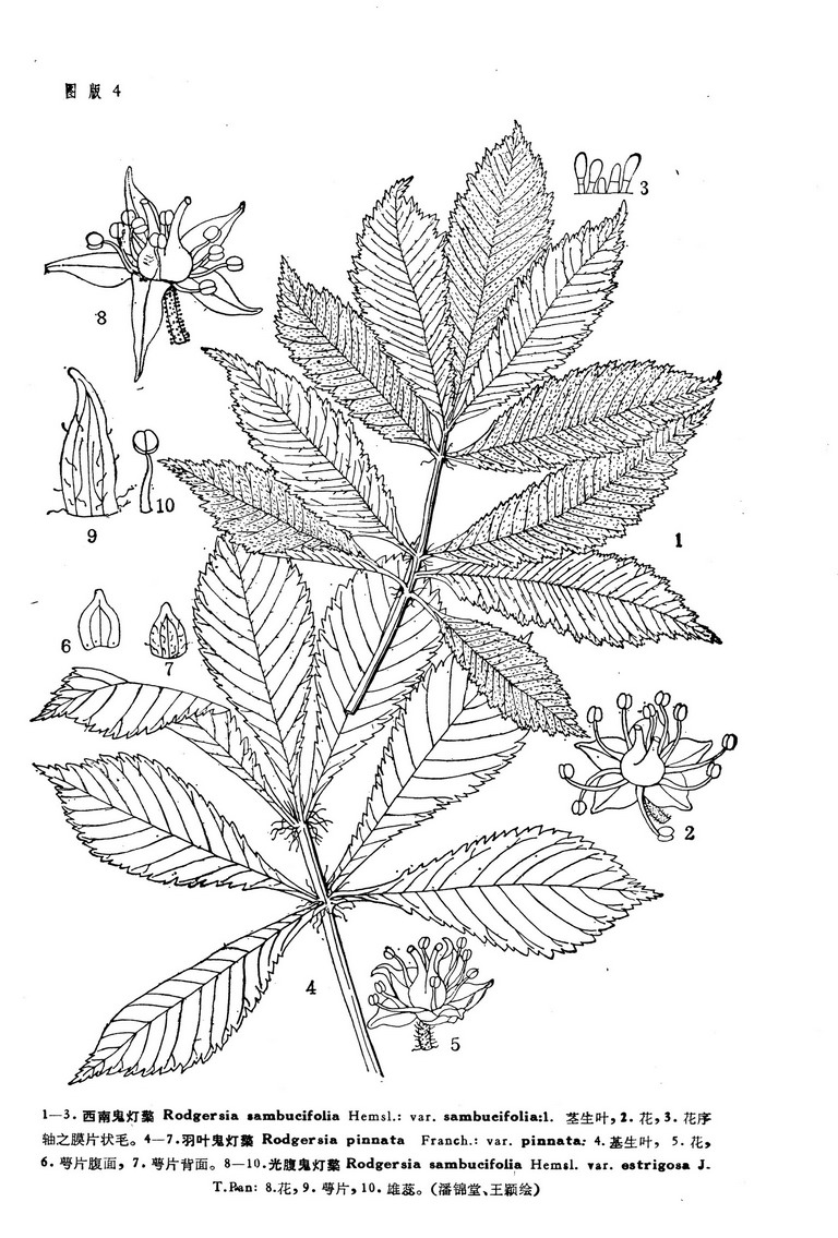 多年生草本,高(0.25-)0.4-1.5米。茎无毛。近羽状复叶;叶柄长3.5-32.5厘米,基部和叶片着生处具褐色长柔毛;基生叶和下部茎生叶通常具小叶片6-9枚,上有顶生者3-5枚,下有轮生者3-4枚,上部茎生叶具小叶片3枚;小叶片椭圆形、长圆形至狭倒卵形,长(6.5-)11-32厘米,宽(2.7-)7-12.5厘米,先端短渐尖,基部渐狭,边缘有重锯齿,腹面无毛,背面沿脉具褐色柔毛。多歧聚伞花序圆锥状,长12-31厘米,具多花;花序分枝长3.5-22厘米;花序轴与花梗被膜片状毛,有时还杂有短腺毛;花梗长1.5-3.5毫米;萼片5,革质,近卵形,长2-2.7毫米,宽约2毫米,先端短渐尖而钝,腹面仅基部疏生近无柄之腺毛,背面被黄褐色柔毛和近无柄之腺毛,具弧曲脉3,脉于先端汇合;花瓣不存在;雄蕊10,长2.8-4毫米;心皮2,长约3毫米,基部合生,子房近上位,花柱2。蒴果紫色,长约7毫米。染色体2n=60。花果期6-8月。