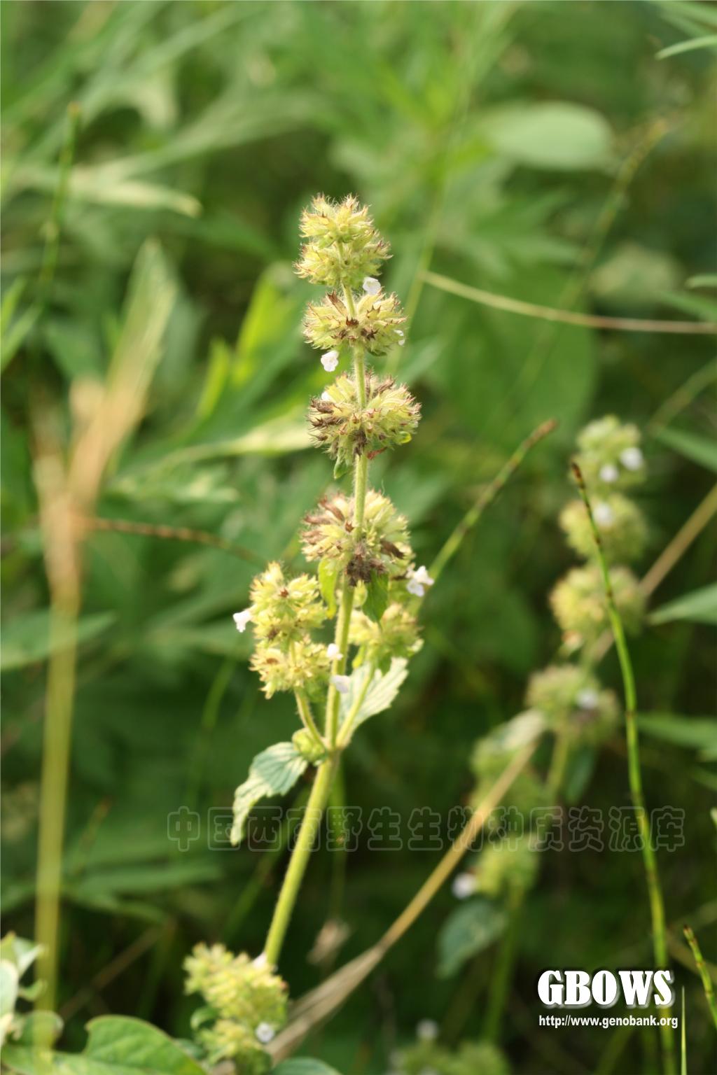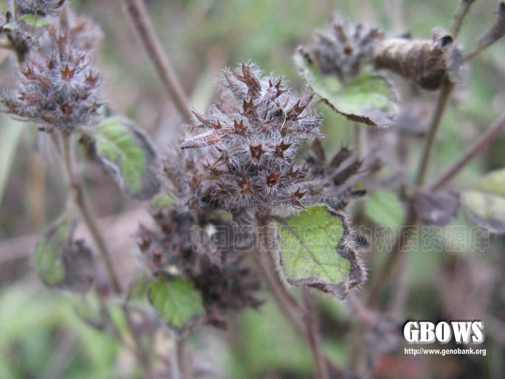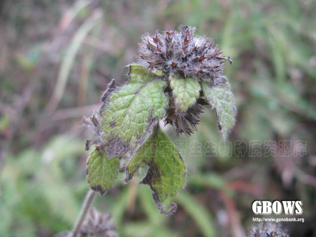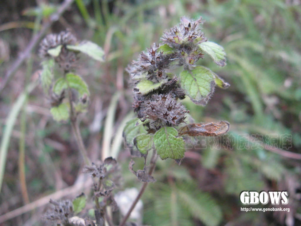 多年生草本。茎基部匍匐生根,上部上升,多分枝,高可达1米,四稜形,具细条纹,密被短柔毛及腺微柔毛。叶卵圆形,不偏斜,长2-4厘米,宽1.3-2.6厘米,先端急尖或钝,基部圆形呈阔楔形,边缘具大小均匀的圆齿状锯齿,坚纸质,上面榄绿色,密被平伏短硬毛,下面灰白色,被疏柔毛,脉上尤密,侧脉5-7对,与中肋在上面微凹陷下面隆起,网脉在下面清晰可见;叶柄长3-8毫米,腹凹背凸,密被疏柔毛。轮伞花序多花密集,半球状,位于下部者径达3厘米,最上部者径1.5厘米,彼此远隔;苞叶叶状,向上渐小至苞片状,苞片针状,极细,无明显中肋,长3-6毫米,多数,被柔毛状缘毛及微柔毛;总梗长约1-2毫米,分枝多数;花梗长约2.5毫米,与总梗及序轴被柔毛状缘毛及微柔毛。花萼狭管状,常染紫红色,长约6毫米,13脉,外面主要沿脉上被疏柔毛及腺微柔毛,内面在齿上被疏柔毛,果时基部稍一边膨胀,上唇3齿,齿近外反,长三角形,先端具硬尖,下唇2齿,齿稍长,直伸,先端芒尖。花冠紫红色,长约9毫米,外面被微柔毛,内面在下唇下方喉部具二列毛茸,冠筒伸出,向上渐扩大,至喉部宽近2毫米,冠檐二唇形,上唇直伸,先端微缺,下唇3裂,中裂片稍大。雄蕊4,前对稍长,均内藏或前对微露出,花药2室,室近水平叉开。花柱微露出,先端不相等2浅裂,裂片扁平。花盘平顶。子房无毛。小坚果倒卵形,长约1.2毫米,宽约0.9毫米,黄褐色。花期5-8月,果期8-10月。