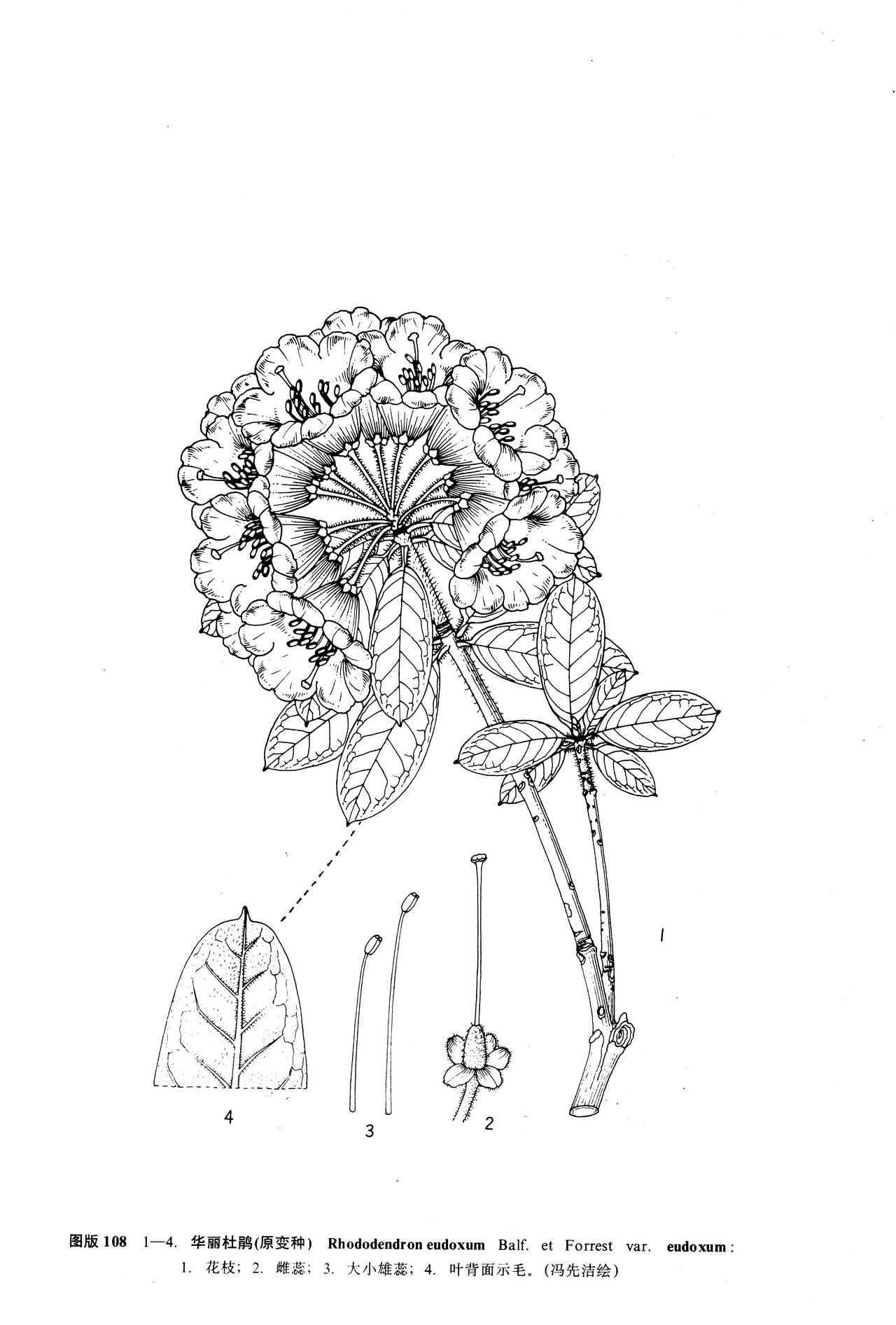 灌木,高0.3-1.2(-1.8)米;树皮灰褐色,片状剥落;幼枝具柔毛,有散生细柔的刚毛,花序下小枝直径2.2-2.4毫米,老枝灰色,有明显的叶痕。叶革质,长椭圆形或长圆状倒卵形,长2.3-3厘米,宽8-14毫米,先端圆或钝,有小尖头,基部楔形,边缘反卷,上面绿色,下面淡黄绿色,有薄的毛被,在脉上具灰白色的丛卷毛,中脉在上面凹下,下面凸出,侧脉7-9对;叶柄长约2-3毫米,略被灰白色丛卷毛及少数细刚毛。顶生伞形花序有花3-5(-10)朵;花梗长1-1.2厘米,密被棕红色丛卷毛及少数有柄腺体;花萼小,杯状,长约1.5毫米,外面疏具腺毛,裂齿波状,边缘有腺毛;花冠管状钟形,长2.5厘米,宽2.7厘米,深红色,内面下部有白色微柔毛,基部有5枚黑红色的蜜腺囊,裂片5,圆形,长1.1厘米,顶端有浅缺刻;雄蕊10,不等长,长1-1.6厘米,花丝近于无毛,花药长圆形,淡黄褐色,长1.7-2毫米;子房卵圆形,长3.4-4毫米,密被长腺毛及少数绒毛,花柱长2.8厘米,无毛,柱头头状,宽约2.3毫米。蒴果圆柱形,褐色,长约1.2厘米,有腺毛残迹。花期6-月,果期10-11月。