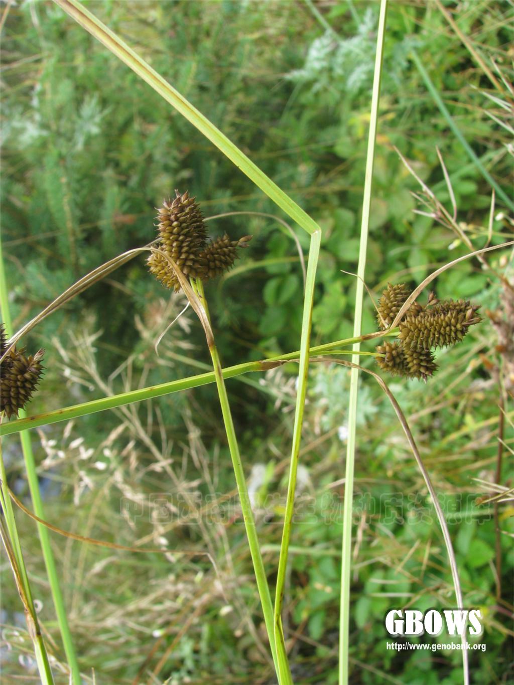 根状茎具匍匐茎。秆高15-70厘米,纤细,三棱形,基部具紫褐色叶鞘。叶与秆近等长,宽2-5毫米,平张,柔软。苞片叶状,长于花序。小穗3-5个,顶生1个雌雄顺序,长圆形,长5-8毫米;侧生小穗雌性,卵形或长圆形,长5-9毫米;小穗柄纤细,最下部的长1-4厘米,上部的柄渐短。雌花鳞片宽卵形,顶端钝或稍尖,长约1.2毫米,暗紫色或中间淡绿色,两侧深棕色,有1-3脉。果囊长于鳞片1倍,倒卵形或倒卵状椭圆形,三棱形,长2-2.2毫米,膨胀,淡黄绿色,脉明显,顶端具暗紫红色的短喙,喙口微凹或截形。小坚果倒卵形,三棱形,长1.2-1.7毫米;花柱短,柱头3个。花果期7-8月。