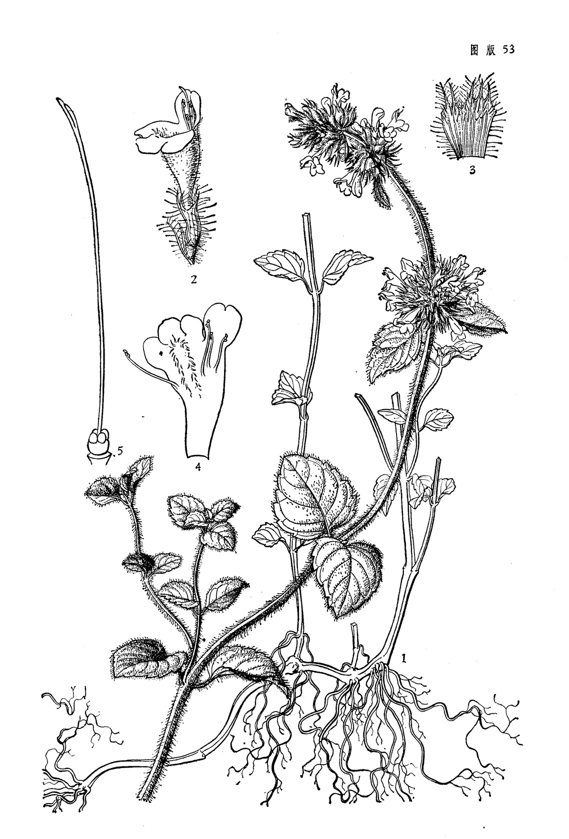 多年生草本。茎多数,自根茎生出,高可达60厘米,基部匍匐生根,简单或分枝,四稜形,具浅槽,常染紫红色,极密被白色平展刚毛,下部较疏,节间伸长,比叶片长很多。叶三角状卵圆形,长1.2-2厘米,宽1-1.7厘米,先端钝或锐尖,基部圆形或近浅心形,边缘为圆齿状锯齿,上面榄绿色,被白色纤毛,近边缘较密,下面较淡,主沿各级脉上被白色纤毛,余部有不明显小凹腺点,侧脉4-5对,与中脉在上面微凹陷或近平坦,下面带紫红色,明显隆起;叶柄极短,长1-3毫米,常带紫红色,密被白色平展刚毛。轮伞花序多花密集,半球形,花时连花冠径达3.5厘米,生于茎、枝顶部,向上聚集;苞叶叶状,下部的略超出花萼,向上渐变小,呈苞片状,苞片针状,具肋,与花萼等长或略短,被白色平展缘毛及微小腺点,先端染紫红色。花萼圆筒状,开花时长约9毫米,13脉,外面主要沿脉上被白色刚毛,余部满布微小腺点,内面在喉部以上被白色疏柔毛,果时基部稍一边膨胀,上唇3齿,齿长三角形,多少外反,先端短芒尖,下唇2齿,齿与上唇近等长,三角形,先端长芒尖。花冠粉红色,较大,长1.5-2厘米,外面被微柔毛,内面在下唇下方具二列柔毛,冠筒十分伸出,基部宽1.5毫米,自伸出部分向上渐扩大,至喉部宽达5毫米,冠檐二唇形,上唇直伸,先端微缺,下唇3裂,中裂片较大。雄蕊4,前对较长,均延伸至上唇下,几不超出,花药卵圆形,2室,室略叉开。花柱微超出上唇片,先端不相等2浅裂,裂片扁平。花盘平顶。子房无毛。小坚果倒卵形,长约1毫米,宽约0.9毫米,褐色,无毛。花期7-9月,果期8-11月。