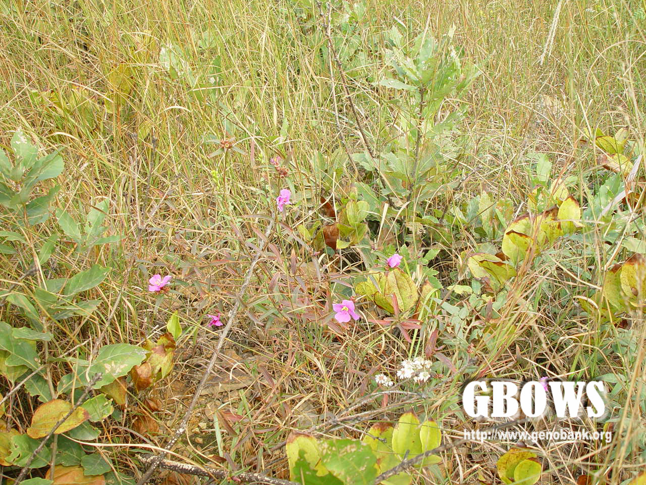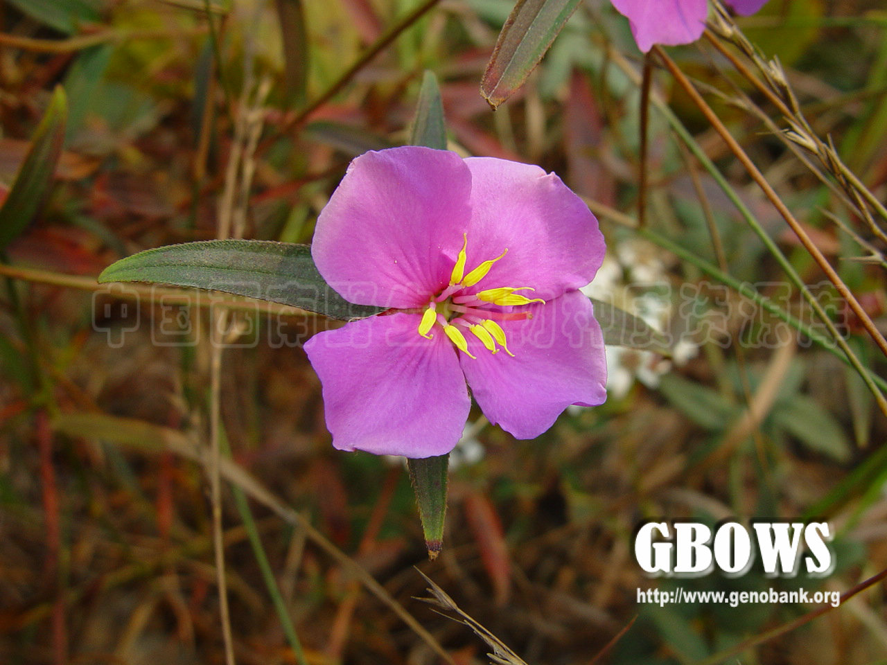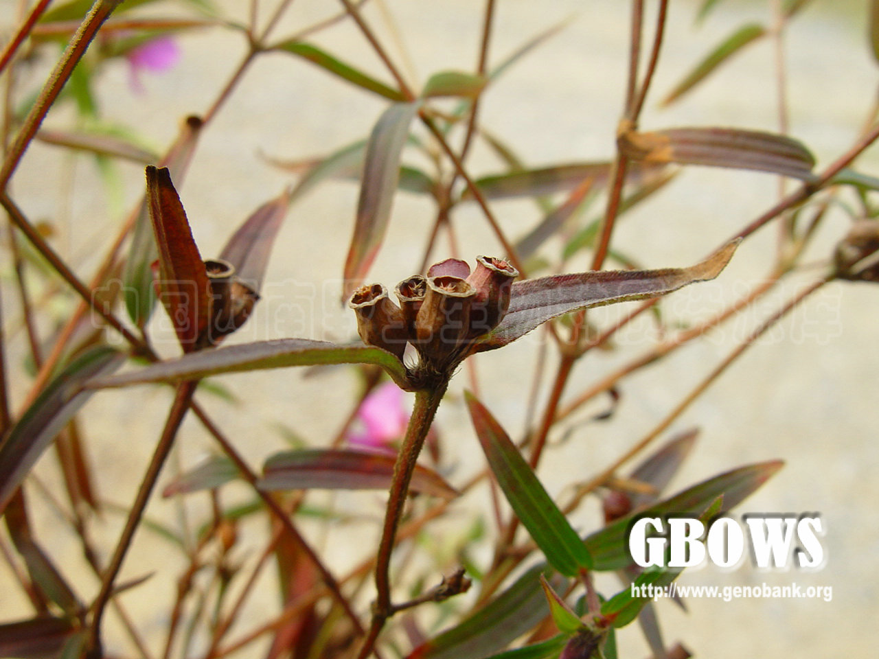 直立草本或亚灌木,高20-60厘米;茎四棱形,具紧贴的糙伏毛。叶片坚纸质,线形或线状披针形,极稀卵状披针形,顶端急尖,基部钝或几圆形,长2-4 (-5)厘米,宽3-8(-15)毫米,全缘,两面被糙伏毛,3-5基出脉,于背面隆起,细脉不明显;叶柄短或几无,被糙伏毛。头状花序,顶生,有花2-8(-10)朵,基部具叶状总苞2-6枚,苞片卵形,被毛或背面无毛,无花梗,萼管长约6毫米,通常带红色,无毛或具1-5枚刺毛突起,裂片4,三角状披针形,与萼管等长,具缘毛,各裂片间外缘具1刺毛突起,果时随萼片脱落;花瓣4,淡紫红色或粉红色,倒卵形,长约1厘米,具缘毛;雄蕊常偏向1侧,花丝与花药等长,花药顶部具长喙,喙长为花药的1/2,药隔基部微膨大呈盘状;子房近球形,顶端有刚毛16条。蒴果紫红色,卵状球形,4纵裂,宿存萼坛状,长约6毫米,直径约4毫米,外面无毛或具少数刺毛突起。花期7-9月,果期9-11月。