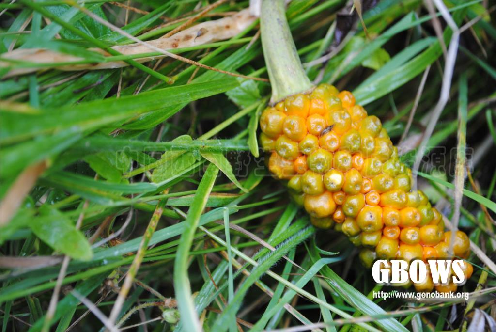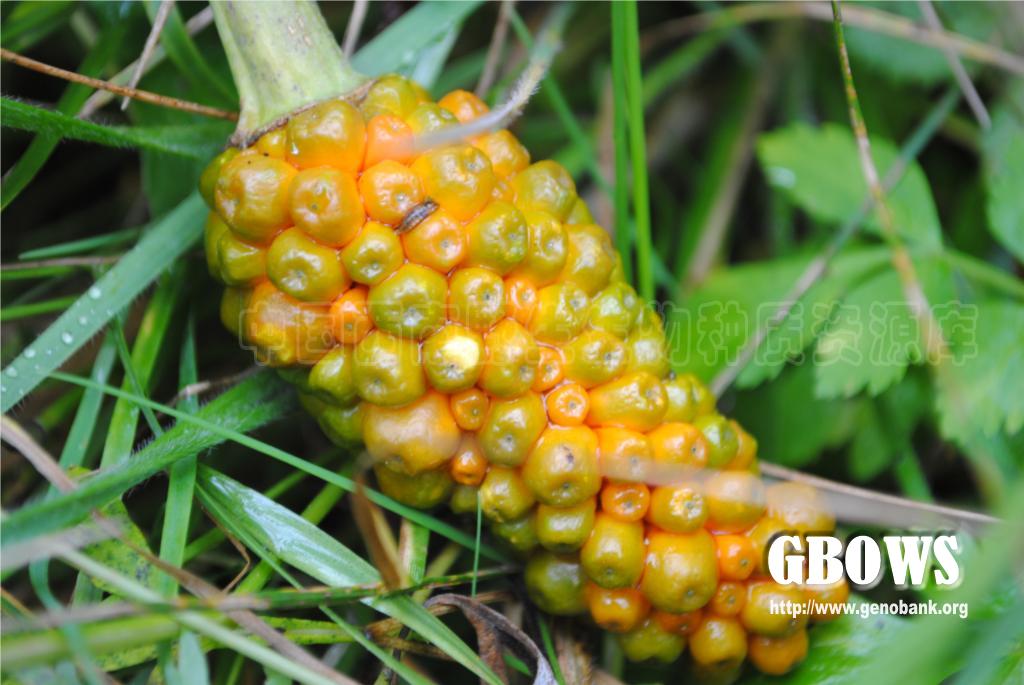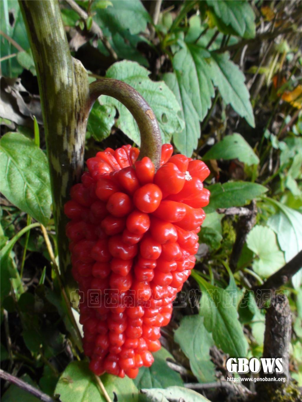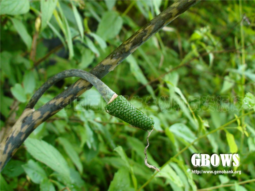 块茎扁球形,直径可达6厘米,表皮黄色,有时淡红紫色。鳞叶绿白色、粉红色、有紫褐色斑纹。叶1,极稀2,叶柄长40-80厘米,中部以下具鞘,鞘部粉绿色,上部绿色,有时具褐色斑块;叶片放射状分裂,裂片无定数;幼株少则3-4枚,多年生植株有多至20枚的,常1枚上举,余放射状平展,披针形、长圆形至椭圆形,无柄,长(6-)8-24厘米,宽6-35毫米,长渐尖,具线形长尾(长可达7厘米)或否。花序柄比叶柄短,直立,果时下弯或否。佛焰苞绿色,背面有清晰的白色条纹,或淡紫色至深紫色而无条纹,管部圆筒形,长4-8毫米,粗9-20毫米;喉部边缘截形或稍外卷;檐部通常颜色较深,三角状卵形至长圆状卵形,有时为倒卵形,长4-7厘米,宽2.2-6厘米,先端渐狭,略下弯,有长5-15厘米的线形尾尖或否。肉穗花序单性,雄花序长2-2.5厘米,花密;雌花序长约2厘米,粗6-7毫米;各附属器棒状、圆柱形,中部稍膨大或否,直立,长2-4.5厘米,中部粗2.5-5毫米,先端钝,光滑,基部渐狭;雄花序的附属器下部光滑或有少数中性花;雌花序上的具多数中性花。雄花具短柄,淡绿色、紫色至暗褐色,雄蕊2-4,药室近球形,顶孔开裂成圆形。雌花:子房卵圆形,柱头无柄。果序柄下弯或直立,浆果红色,种子1-2,球形,淡褐色。花期5-7月,果9月成熟。