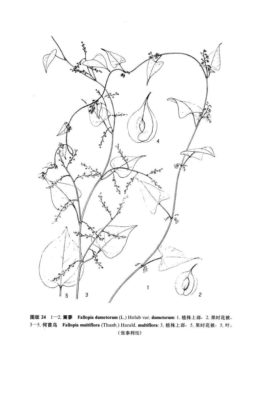 一年生草本。茎缠绕,长70-150厘米,具纵棱,沿棱具小突起,无毛,多分枝。叶卵状心形,长3-6厘米,宽1.5-4厘米,顶端渐尖,基部心形或箭形,两面无毛,沿叶脉具小突起,边缘全缘;叶柄长1-3厘米,具小突起;托叶鞘短,膜质,偏斜,长2-3毫米,顶端尖,无缘毛。花序总状,通常腋生,稀疏;苞片膜质,长1.5-2毫米,具脉,每苞内具2-5花;花梗细弱,丝形,果时延长,长3-5毫米,中下部具关节;花被5深裂,淡绿色,花被片椭圆形,外面3片背部具翅,果时增大,翅近膜质,全缘,基部微下延;花被果时外形呈圆形,直径4-5毫米;雄蕊8;花柱3, 柱头头状。瘦果椭圆形,长3-4毫米,具3棱,黑色,平滑,有光泽,包于宿存花被内。花期6-8月,果期8-9月。