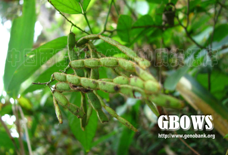 直立灌木或亚灌木,高1-2米。树皮灰褐色,分枝多,上部分枝略被柔毛。叶为羽状三出复叶,小叶3;托叶披针状线形,长5-10毫米,基部宽约1毫米,具条纹,宿存,叶柄长1.5-4厘米,扁平,较厚,上面具深沟,多少被柔毛,两侧具极窄的翅;小叶近革质或纸质,顶生小叶披针形或长圆形,长5-9厘米,宽1.5-2.5厘米,侧生小叶较小,先端渐尖,急尖或短渐尖,基部楔形,全缘,上面绿色,有光泽,疏被极短柔毛、老时渐变无毛,下面疏被贴伏短柔毛,中脉上毛较密,侧脉每边10-12条,不达叶缘;小托叶丝状,长2-5毫米;小叶柄长达14毫米,总状花序顶生或腋生,长5-30厘米,花序轴密被柔毛并混生小钩状毛,每节生2花;苞片钻形,长约3毫米;花梗长3-4毫米,密被贴伏柔毛;花萼窄钟形,长3.5-4毫米,被贴伏柔毛和钩状毛,裂片披针形,上部裂片先端微2裂;花冠绿白或黄白色,长约5毫米,具明显脉纹,旗瓣椭圆形,瓣柄极短,翼瓣狭长圆形,具瓣柄,龙骨瓣长圆形,具瓣柄;雄蕊二体;雌蕊长约7毫米,子房在缝线上密被贴伏柔毛。荚果线形,扁平,长5-7厘米,稍弯曲,被伸展的钩状毛,腹背缝线浅缢缩,有荚节4-8,荚节长椭圆形,长9-12毫米,宽约3毫米。花期7-9月,果期9-l1月。