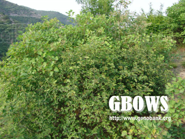 落叶灌木,高可达3米;幼枝、叶下面、叶柄及花序均被由黄白色簇状毛组成的绒毛;芽常被带锈褐色簇状毛;二年生小枝稍四角状,灰褐色,老枝圆筒形,散生圆形小皮孔。叶纸质,卵状椭圆形、宽卵形或近圆形,长3-6 (-8) 厘米,顶端钝或圆形,有时微凹或稍尖,基部圆形,边缘有较密的小尖齿,初时上面疏被叉状或簇状短毛,侧脉5-7对,近缘处互相网结或部分直伸至齿端,连同中脉上面凹陷,下面凸起,小脉两面稍凸起;叶柄长7-10 (-15) 毫米。聚伞花序直径(4-) 6-7 (-8) 厘米,结果时可达9厘米,总花梗长1-1.5 (-7) 厘米或很短,第一级辐射枝 (3-) 5条,长1-2厘米,中间者最短,花大部生于第三级分枝上;萼筒圆筒形,长3.5-4毫米,宽约1.5毫米,无毛,萼齿卵形,长约1毫米,顶钝;花冠白色,辐状,直径约6毫米,无毛,筒部长约1毫米,裂片圆卵形,长约2毫米;雄蕊与花冠等长或略较长,花药圆形,直径约1毫米。果实红色而后变黑色,椭圆形,长约8毫米;核卵圆形,长6-8毫米,直径4-5毫米,背部龟背状凸起而无沟或有2条不明显的沟,腹部有3条沟。花期5-7月,果熟期8-9月。