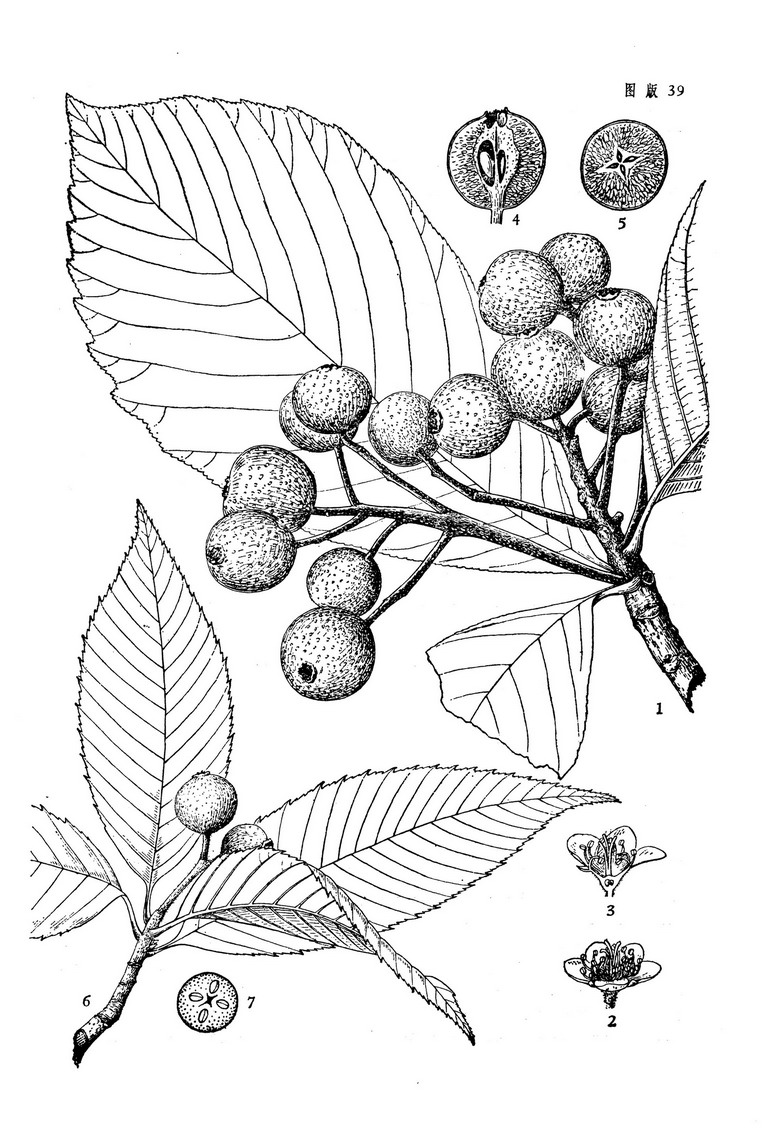 灌木或小乔木,高5-8米,有时附生在其他乔木枝干上面;小枝粗壮,圆柱形,具明显皮孔,幼嫩时微被短柔毛,老时脱落,黑褐色;冬芽膨大,卵形,先端稍钝,外被多数棕褐色鳞片,无毛。叶片椭圆倒卵形或倒卵状长椭圆形,长10-18厘米,宽5-9厘米,先端渐尖,基部楔形或近圆形,边缘有浅裂片和圆钝细锯齿,上下两面均无毛,有时下面脉腋间有少数柔毛,侧脉14-20对,直达叶边锯齿尖端,上面微下陷,下面突起;叶柄长1-1.8厘米,无毛。复伞房花序具多花,总花梗和花梗被短柔毛;花梗长5-8毫米;花直径5-8毫米;萼筒钟状,外面被短柔毛,内面近无毛;萼片宽三角形,先端急尖,外面微具短柔毛,内面无毛;花瓣宽卵形至近圆形,长约3毫米,宽几与长相等,先端圆钝;雄蕊20,约与花瓣等长;花柱3-4,基部合生,与雄蕊等长,无毛。果实卵球形或扁圆形,直径1-1.5厘米,有时达2厘米,长2-3.5厘米,暗褐色,密被锈色斑点,3-4室,萼片残存在果实先端呈短筒状。花期4月,果期7-8月。