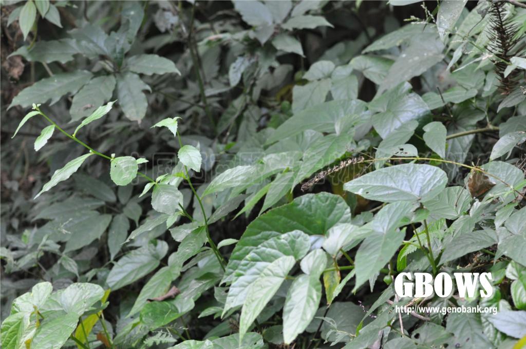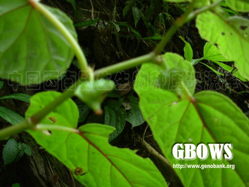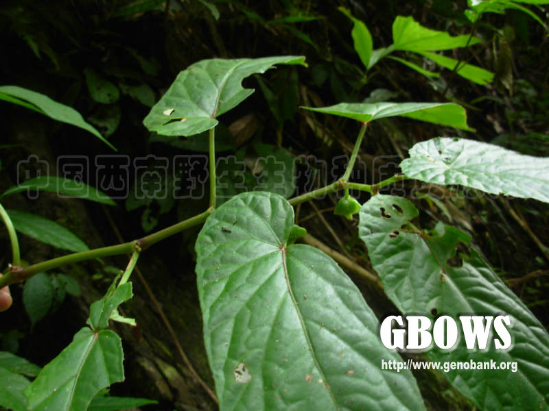 多年生草本。球茎膨大,呈不规则块状,直径可达2.5厘米,有残存褐色的鳞片和多数粗壮纤维状根。茎高0.9-1.5米,直立,细弱,微弯曲,多节,有棱,褐色。叶互生,具柄;叶片两侧极不相等,轮廓披针形至卵状披针形,长8.5-17厘米,宽3.4-7厘米,先端渐尖至尾状渐尖,基部极偏斜,呈微心形,窄侧宽楔形至微心形,宽侧向下延长1.5-5厘米,宽2.5-5.8厘米,呈宽圆耳锤状,边缘有大小不等极疏的带突头之浅齿,齿尖有短芒,幼时明显,上面褐绿色,无毛或近无毛,下面淡绿色,无毛或近无毛,掌状7(-8)条脉,窄侧2 (-3)条,宽侧4条,均达叶缘,中部以上呈羽状脉;叶柄长2.5-4.7厘米,近无毛;托叶膜质,卵状披针形,长6-8毫米,先端渐尖,无毛,早落。花白色,2-4朵,腋生,二歧聚伞状,一次分枝长1.2-1.5厘米,二次分枝长约3毫米;花梗长8-12毫米,近无毛;苞片膜质,披针形,长5-10毫米,先端渐尖,无毛,早落;雄花:花被片4,外轮2枚呈长方形,长约8.5毫米,宽约5-6毫米,先端平,内轮2枚长圆形,长约6毫米,宽约4.5毫米,先端平;雄蕊多数,花丝离生,长1-1.5毫米,花药长圆形,长约1.8毫米,先端微凹;雌花:花被片4,和雄花被片相似;子房近球形,顶端具长约3毫米之粗喙,3室,中轴胎座,每室胎座具2裂片;花柱3,近基部合生,柱头呈螺旋状扭曲,并带刺状乳突。蒴果下垂,果梗长约12毫米;轮廓近球形,直径约17-18毫米,无毛。顶端具粗厚长喙,无翅,无棱;种子极多数,小,淡褐色,光滑。花期4-5月,果期7月。
