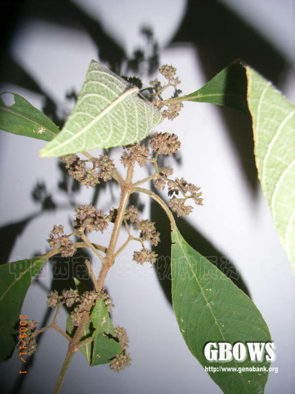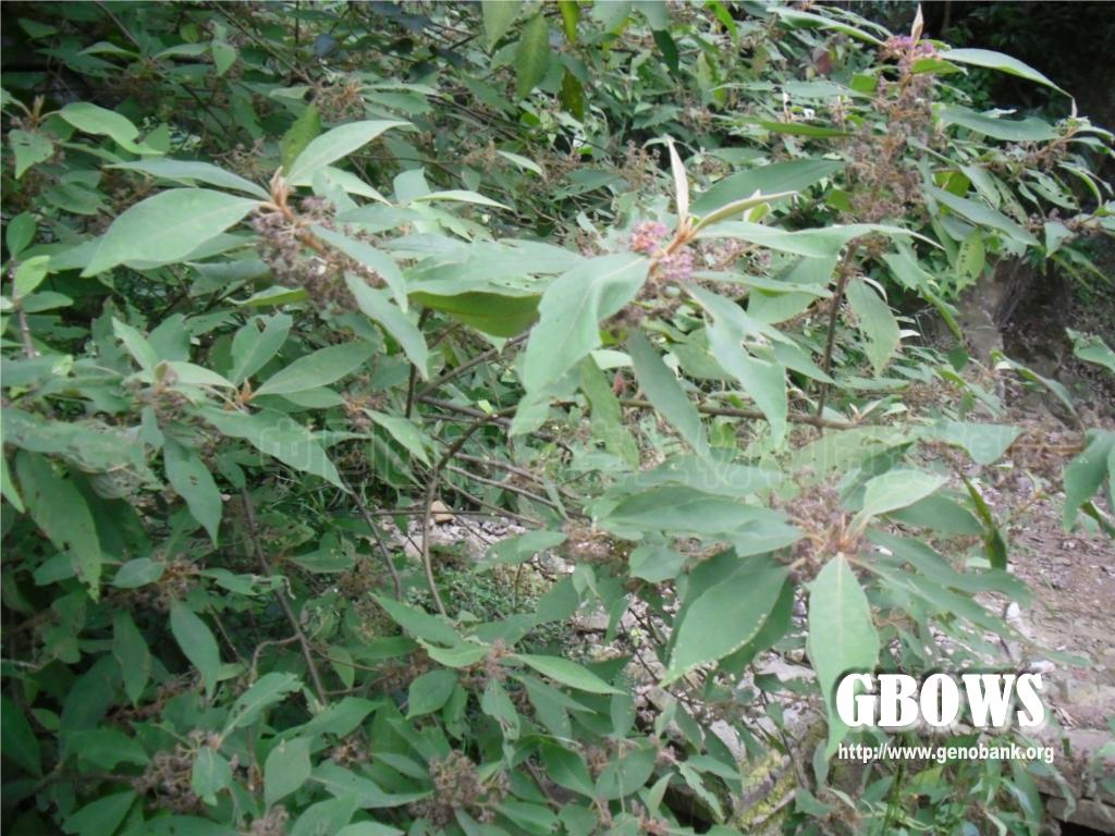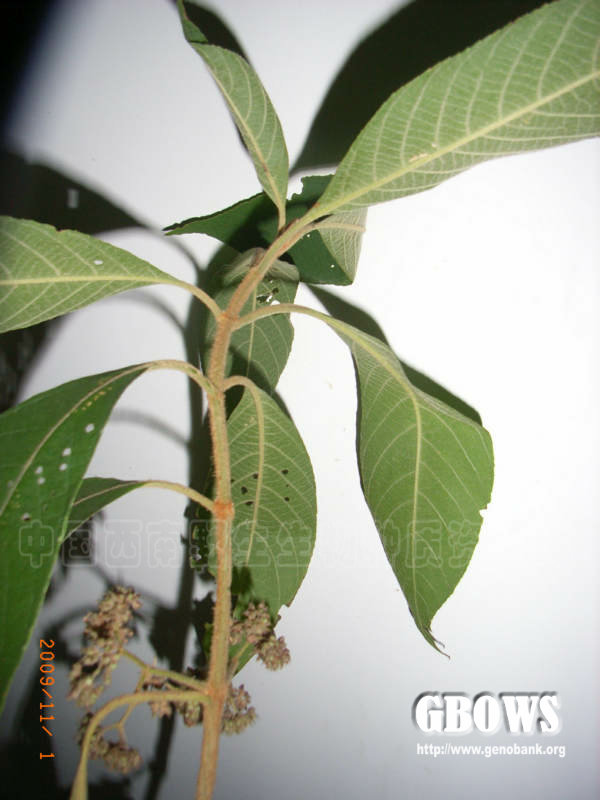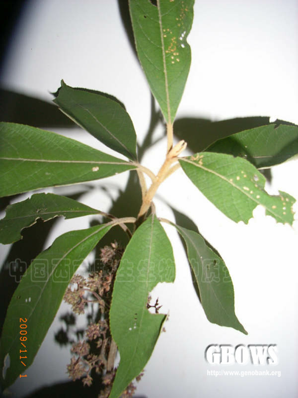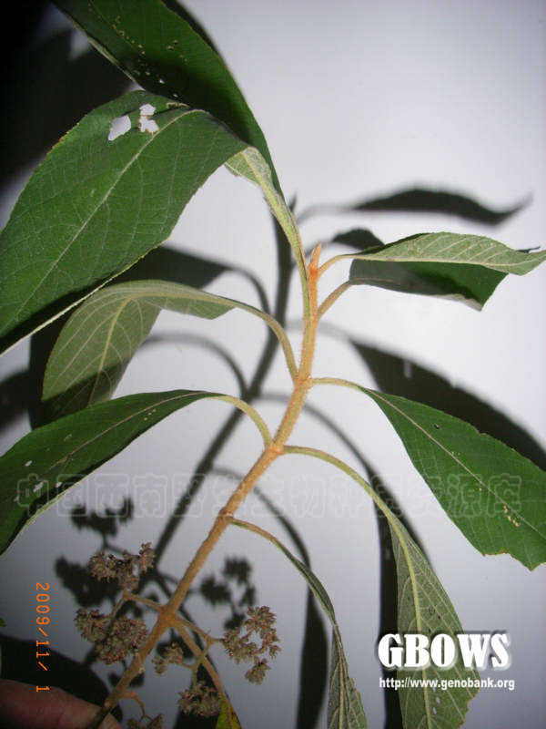 灌木,高1-4米;小枝、叶柄与花序密生黄褐色分枝茸毛。叶片长椭圆形、卵状椭圆形或长椭圆状披针形,长12-22厘米,宽4-8厘米,顶端渐尖或锐尖,基部楔形,边缘有锯齿,表面无毛或疏被毛,通常脉上较密,背面密生黄褐色星状毛和分枝茸毛,两面被不明显的黄色腺点,侧脉10-18对,在叶背隆起;叶柄长1-3厘米。聚伞花序宽3-6厘米, 3-5次分歧;花序梗长1-2厘米;花近无柄,密集于分枝的顶端;花萼管状,被茸毛,萼齿线形或为锐尖狭长三角形.齿长2-2.5毫米;花冠淡红色或紫红色,裂片密被茸毛;雄蕊伸出花冠管外,花丝长约3.5毫米,花药卵圆形,长约1毫米;花柱长过雄蕊,柱头膨大。果实圆球形,径约1.5毫米,几全部包藏于宿存的花萼内。花期7-8月,果期9-12月。