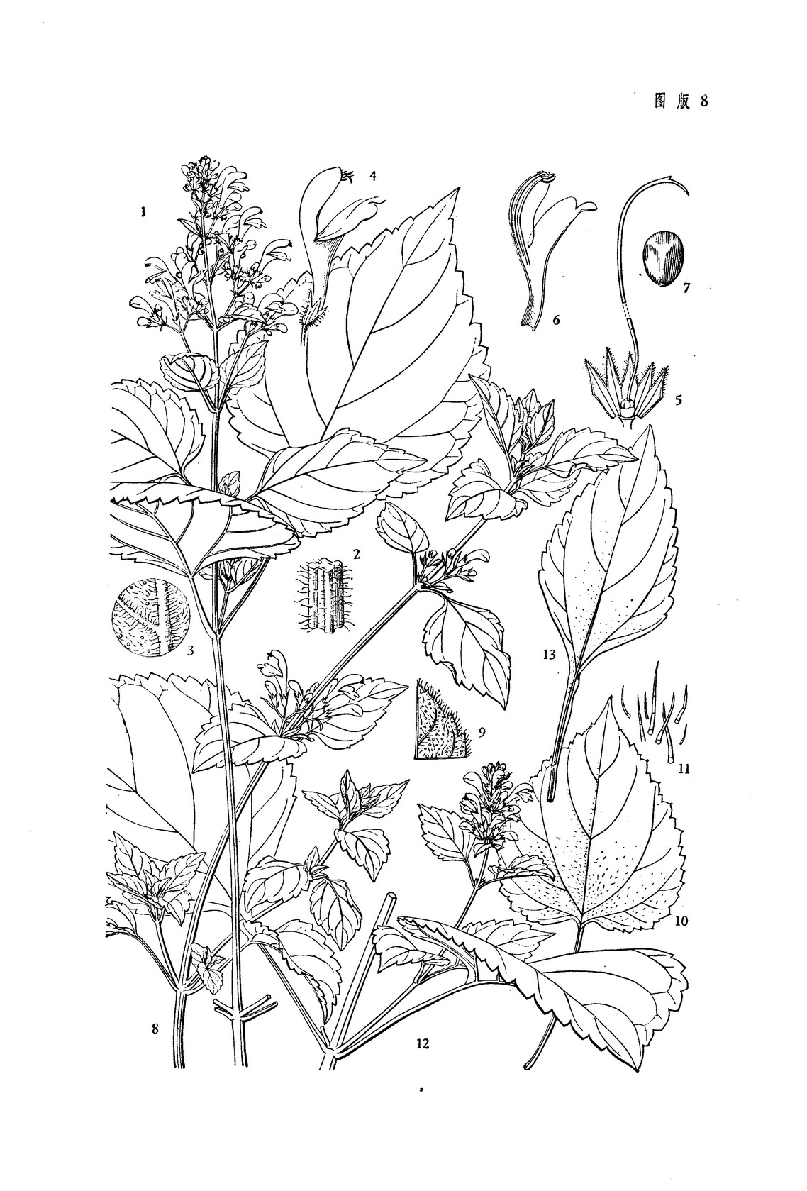 直立草本或半灌木。茎高1-2米,四稜形,被贴生的短柔毛。叶卵圆形或阔卵圆形,长6-10厘米,宽4.5-7.5厘米,先端急尖,基部截状阔楔形,下延至叶柄而成狭翅,薄纸质,上面榄绿色,下面略淡,两面均被微短柔毛,脉上较密,边缘具锯齿状圆齿,齿尖具不明显的小突尖,叶柄扁平,长3-8.5厘米,被贴生的短柔毛。聚伞花序二歧,分枝蝎尾状,在主茎及侧枝上组成开展的顶生圆锥花序。花萼花时钟形,小,长约2.5毫米,直径1.5毫米,外面被微柔毛,内面无毛,齿5,三角状披针形,约占花萼长之半,近等大,后面1齿略长,果时花萼增大。花冠红色,具紫色的盔,长约14毫米,冠筒基部直径约1毫米,向上渐宽,至喉部宽约3毫米,冠檐二唇形,上唇长约7毫米,盔状,先端微缺,基部截形,下唇较长,先端3裂,中裂片较长,舌状,侧裂片较小,三角状。雄蕊4,近等长,包于盔内,花丝丝状,先端极不相等2浅裂。花盘厚环伏。子房无毛。小坚果卵圆状,小,长约1.2毫米,直径约1毫米,腹部具稜,暗褐色,在扩大镜下微具皱纹。花期10-12月,果期12月至翌年1月。