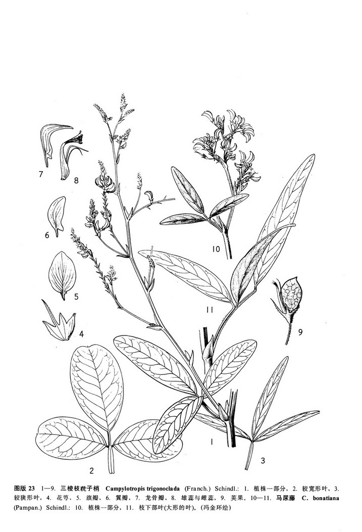 Campylotropis trigonoclada (Franch.) Schindl. in Fedde, Repert. Sp. Nov. 11: 430. 1912; id. in Sargent, Pl. Wils. 2:114. 1914; id. in Fedde, Repert. Sp. Nov. Beih. 49:261. 1928; id. in Hand. -Mazz. Symb. Sin. 7:574. 1933;中国主要植物图说•豆科534. 图529. 1955; 中国高等植物图鉴2: 465. 图2659. 1972; Ohashi in Journ. Jap. Bot. 49:332. 1974;云南种子植物名录上册, 576. 1984.——Lespedeza trigonoclada Franch. Pl. Delav. 167. pl. 42. 1890; Pampan. in Nouv. Giorn. Bot. Ital. 17(1) ; 24. 1910, cum var. angustifolia Pampan. et f. intermedia Pampan.; Levl. Fl. Kouy-Tcheou 237. 1914; id. Cat. Pl. Yunnan 159. 1916.——L. angulicaulis Harms ex Schindl. in Fedde, Repert. Sp. Nov. 9:522. 1911.——L. balfouriana Diels ex Schindl. l. c.; Levl. op. cit. 157. 1916.——Campylotropis balfouriana (Diels ex Schindl.) Schindl. in Fedde, Repert. Sp. Nov. 11:430. 1912; id. in Fedde, Repert. Sp. Nov. Beih. 49: 259. 1928.——C. alata Schindl. in Fedde, Repert. Sp. Nov. 11:431. 1912; Levl. Cat. Pl. Yunnan 157. 1916.