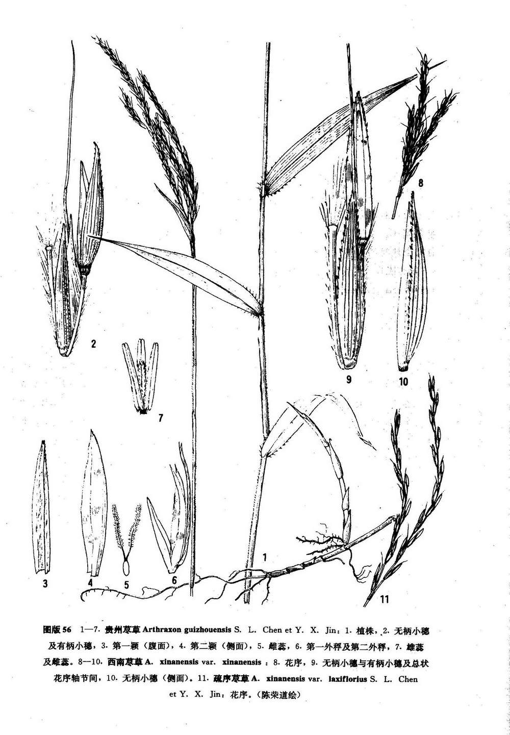 多年生。秆基部倾斜,高30-60厘米,多分枝,具多节,节上疏被毛,节着地易生根。叶鞘短于节间,疏被疣基毛及边缘被纤毛;叶舌膜质,长0.5-1毫米,被纤毛;叶片披针形,长3-6厘米,宽0.5-1.5毫米,先端尾状渐尖,基部心形,抱茎,边缘被疣基毛,两面被毛。总状花序长3-10厘米,2至数枚呈指状排列于枝顶,花序下部疏被毛;总状花序轴节间长为无柄小穗的2/3-4/5,密被白色纤毛。无柄小穗披针形,长5-5.5毫米;第一颖披针形,草质,长5-5.5毫米,背腹压扁,先端尖,两侧呈龙骨,具1行篦齿状疣基钩毛,具7-9脉,近顶端的脉上及脉间具硬刺毛;第二颖与第一颖等长,舟形,质薄,边缘具脱落纤毛;第一外稃长约4毫米,透明膜质,先端2裂;第二内稃狭披针形,长为外稃之1/3;雄蕊3,花药长约3.5毫米。有柄小穗披针形,长约4毫米;第一颖草质,具5-7脉,先端尖,边缘质较薄;第二颖与第一颖等长,具3脉,边缘近膜质易内折成2脊;第一外稃与第二外稃均透明膜质,长约为颖的3/5,无芒;雄蕊3,花药长约2.5毫米。花果期9-11月。