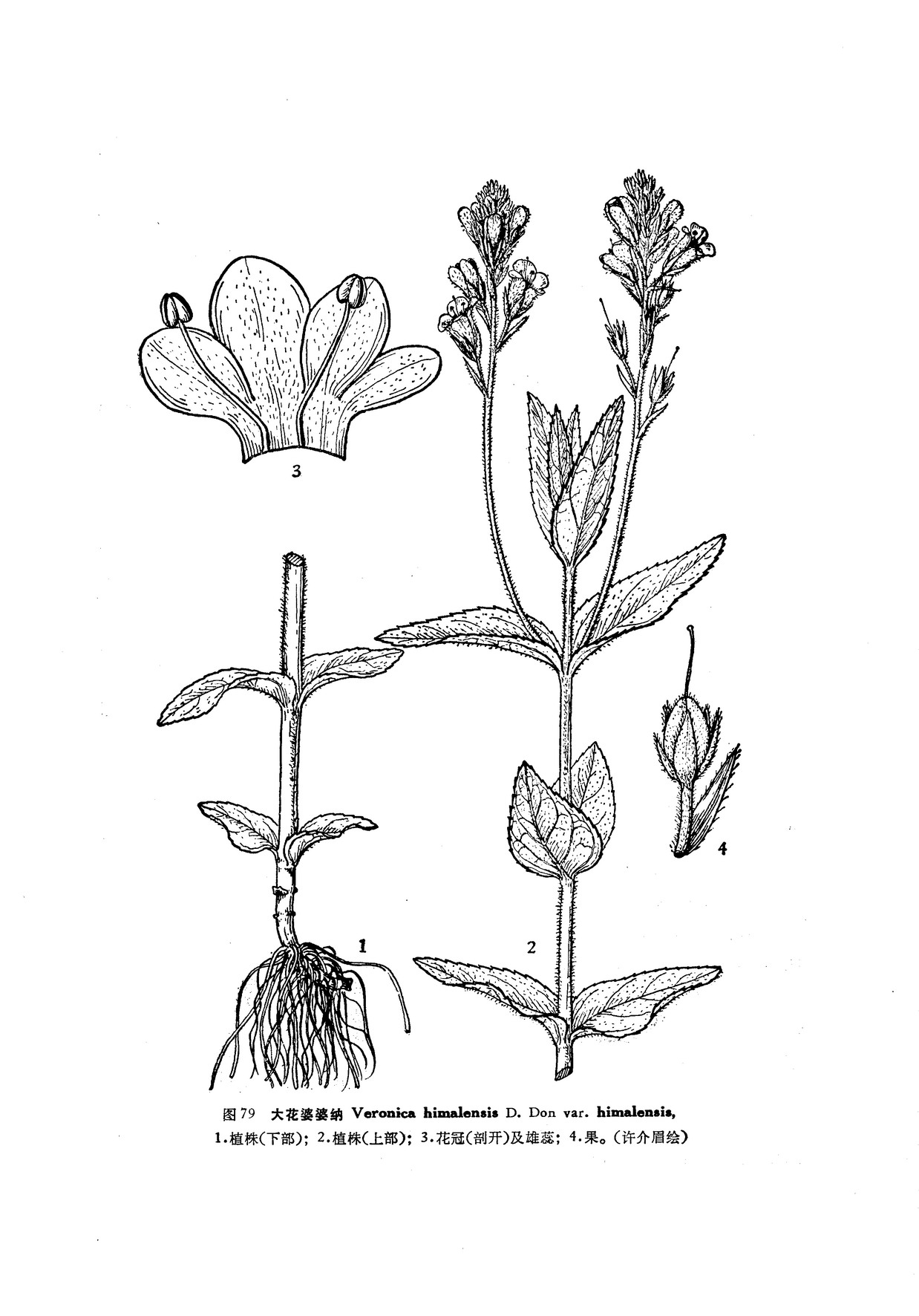 植株高40-60厘米。茎直立,不分枝或有时下部分枝,被柔毛。叶无柄,上部的叶多少抱茎,卵形至卵状披针形,长3-5厘米,宽2-3厘米,基部宽楔形至圆钝,顶端钝、急尖至渐尖,边缘具尖锯齿,夹杂有重锯齿,两面疏被柔毛。总状花序2-4支,侧生于茎近顶端叶腋,长达15厘米,花疏离,花序各部分被多细胞柔毛;苞片宽条形,与花梗近等长;花梗直,长达1厘米;花萼裂片宽条形或披针形,长7毫米;花冠蓝色或紫色,长1厘米,外被多细胞腺毛,筒长2.5毫米,内有长柔毛,裂片倒卵形至椭圆形;雄蕊略短于花冠。蒴果卵形,顶端急尖,长8毫米,宽约5毫米,顶端疏生多细胞柔毛或几乎无毛,花柱长5-10毫米。种子长1毫米。花期6-7月。
