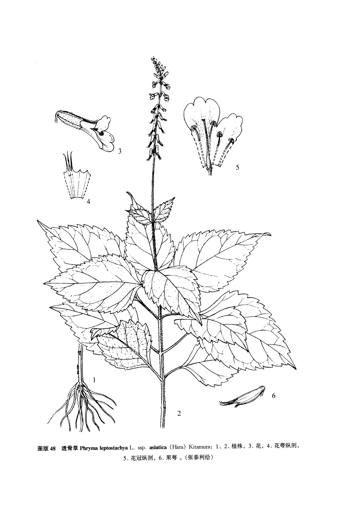 多年生草本,高(10-) 30-80 (-100)厘米。茎直立,4棱形,不分枝或于上部有带花序的分枝,分枝叉开,绿色或淡紫色,遍布倒生短柔毛或于茎上部有开展的短柔毛,少数近无毛。叶对生;叶片卵状长圆形、卵状披针形、卵状椭圆形至卵状三角形或宽卵形,草质,长(1-)3-11(-16)厘米,宽(1-)2-8厘米,先端渐尖、尾状急尖或急尖,稀近圆形,基部楔形、圆形或截形,中、下部叶基部常下延,边缘有 (3-)5至多数钝锯齿、圆齿或圆齿状牙齿,两面散生但沿脉被较密的短柔毛;侧脉每侧4-6条;叶柄长0.5-4厘米,被短柔毛,有时上部叶柄极短或无柄。穗状花序生茎顶及侧枝顶端,被微柔毛或短柔毛;花序梗长3-20厘米;花序轴纤细,长(5-)10-30厘米;苞片钻形至线形,长1-2.5毫米;小苞片2,生于花梗基部,与苞片同形但较小,长0.5-2毫米。花通常多数,疏离,出自苞腋,在序轴上对生或于下部互生,具短梗,于蕾期直立,开放时斜展至平展,花后反折。花萼筒状,有5纵棱,外面常有微柔毛,内面无毛,萼齿直立;花期萼筒长2.5-3.2毫米;上方萼齿3,钻形,长1.2-2.3毫米,先端多少钩状,下方萼齿2,三角形,长约0.3毫米。花冠漏斗状筒形,长6.5-7.5毫米,蓝紫色、淡红色至白色,外面无毛,内面于筒部远轴面被短柔毛;筒部长4-4.5毫米,口部直径约1.5毫米,基部上方直径约0.7毫米;檐部2唇形,上唇直立,长1.3-2毫米,先端2浅裂,下唇平伸,长2.5-3毫米,3浅裂,中央裂片较大。雄蕊4,着生于冠筒内面基部上方2.5-3毫米处,无毛;花丝狭线形,长1.5-1.8毫米,远轴2枚较长;花药肾状圆形,长0.3-0.4毫米,宽约0.5毫米。雌蕊无毛;子房斜长圆状披针形,长1.9-2.2毫米;花柱细长,长3-3.5毫米;柱头2唇形,下唇较长,长圆形。瘦果狭椭圆形,包藏于棒状宿存花萼内,反折并贴近花序轴,萼筒长4.5-6毫米,上方3萼齿长1.2-2.3毫米。种子1,基生,种皮薄膜质,与果皮合生。花期6-10月,果期8-12月。