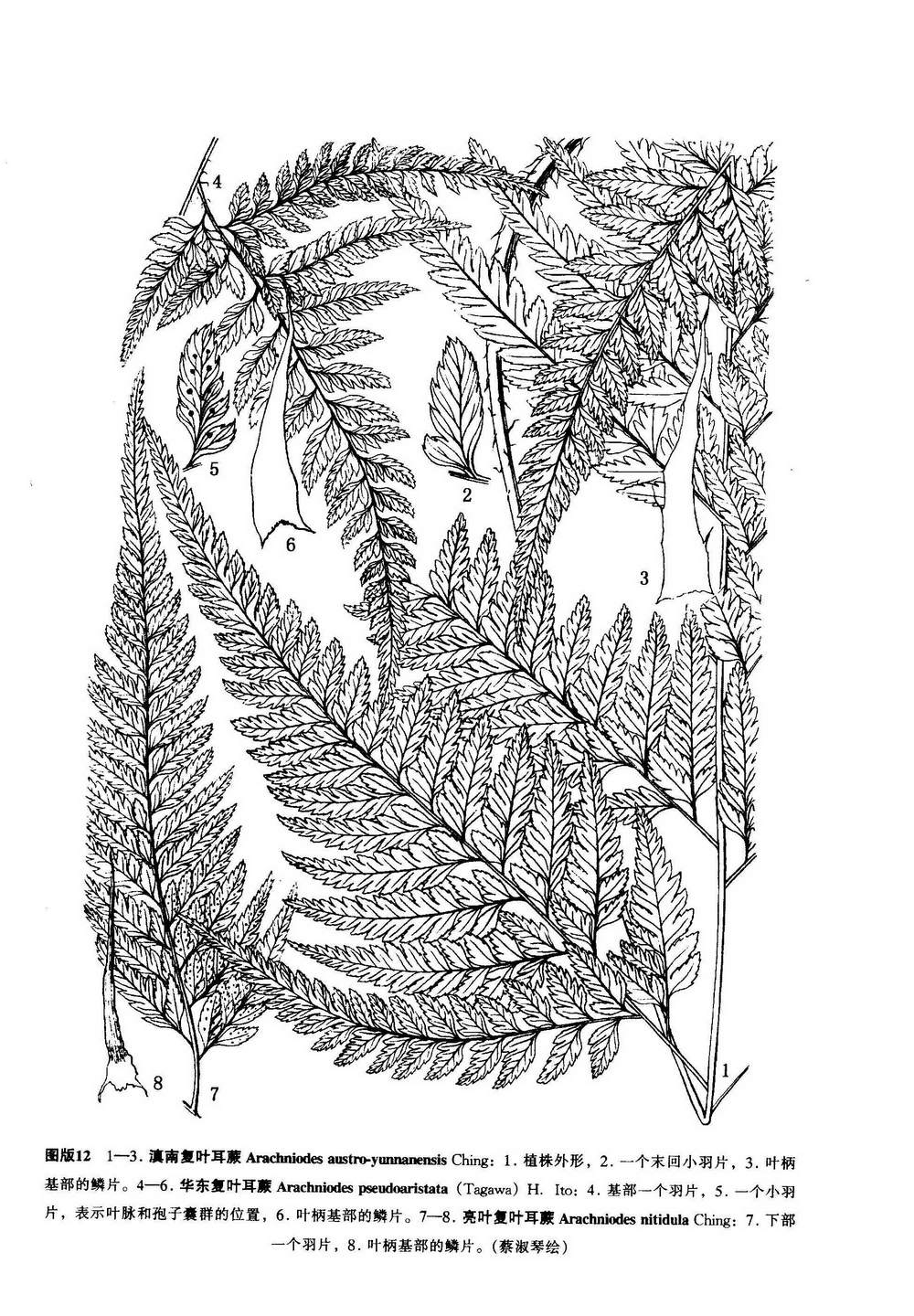 Arachniodes pseudo-aristata (Tagawa) Ohwi in journ. Jap. Bot. 37: 76. 1962; Ching in Acta Bot. Sin. 10: 259. 1962: 台湾植物志1: 365. Pl. 128. 1975; 江苏植物志上册64. 图94. 1976: 安徽植物志1: 164. 图168. 1985.——Polystichum pseudo-aristata Tagawa in Acta Phytotax. Geohot. 1: 91 1932.——Rumohra pseudo-aristata H. Ito in Journ. Jap. Bot. 11: 577. 1935. ——Polystichopsis pseudo-aristata Tagawa in Journ. Jap. Bot. 33: 95. 1958.