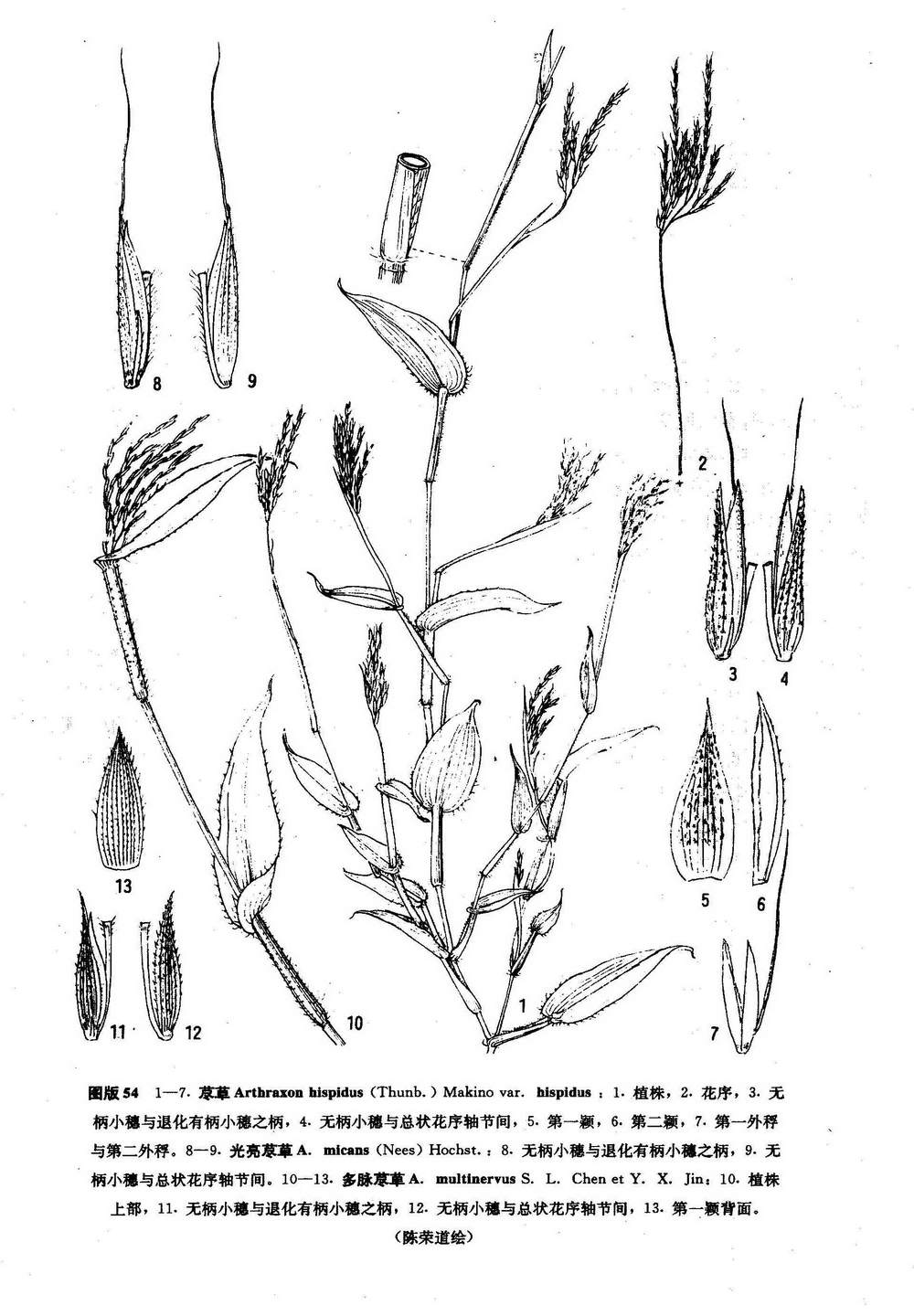 一年生。秆细弱,无毛,基部倾斜,高30-60厘米,具多节,常分枝,基部节着地易生根。叶鞘短于节间,生短硬疣毛;叶舌膜质,长0.5-1毫米,边缘具纤毛;叶片卵状披针形,长2-4厘米,宽0.8-1.5厘米,基部心形,抱茎,除下部边缘生疣基毛外余均无毛。总状花序细弱,长1.5-4厘米,2-10枚呈指状排列或簇生于秆顶;总状花序轴节间无毛,长为小穗的2/3-3/4。无柄小穗卵状披针形,呈两侧压扁,长3-5毫米,灰绿色或带紫;第一颖草质,边缘膜质,包住第二颖2/3,具7-9脉,脉上粗糙至生疣基硬毛,尤以顶端及边缘为多,先端锐尖;第二颖近膜质,与第一颖等长,舟形,脊上粗糙,具3脉而2侧脉不明显,先端尖;第一外稃长圆形,透明膜质,先端尖,长为第一颖的2/3;第二外稃与第一外稃等长,透明膜质,近基部伸出一膝曲的芒;芒长6-9毫米,下几部扭转;雄蕊2; 花药黄色或带紫色,长0.7-1毫米。颖果长圆形,与稃体等长。有柄小穗退化仅到针状刺,柄长0.2-1毫米。染色体2n=10 (Sindhe et al. , 1975);2n=18(Mehra & Kalia, 1975);2n=36 (Tateoka,1953;Chen,Hsu,1960;Gould & Soderstrom, 1970,Pohl & Davidse,1971)。花果期9-11月。
