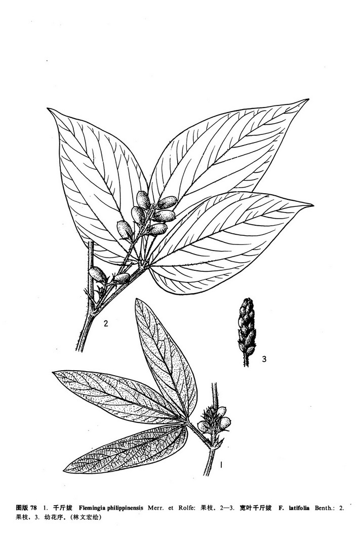 Flemingia philippinensis Merr. et Rolfe in Philip. Journ. Sci. 31: 103. 1908;台湾植物志3: 288. 1977.——Moghania philippinensis (Merr. et Rolfe) H. L. Li in Amer. Journ. Bot. 31:227. 1944; 海南植物志2:311. 1965;中国高等植物图鉴2: 510. 图2749. 1972.——M. prostrata Wang et Tang中国主要植物图说•豆科, 707. 1955, non Flemingia prostrata Roxb. Fl. Ind. 3: 338. 1832; 广州植物志361. 1956.