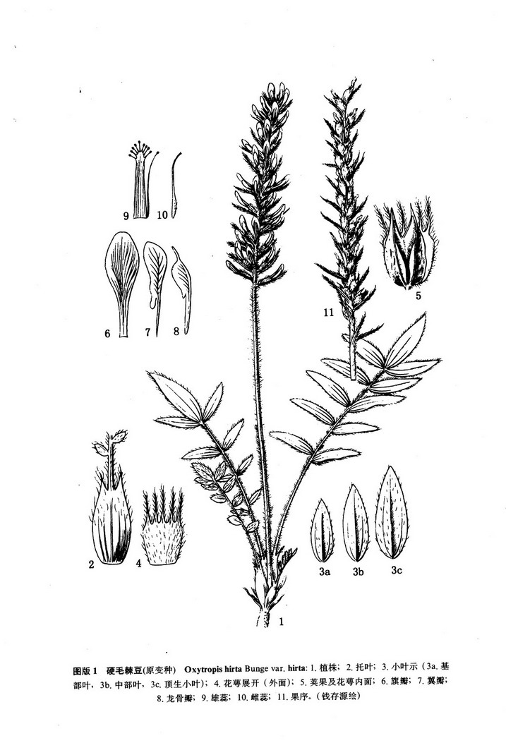 多年生草本,高20-55厘米,被长硬毛,灰绿色。根很长,褐色。茎极缩短。羽状复叶长15-25 (30) 厘米,坚挺;托叶膜质,坚硬,披针状钻形,长20-33毫米,与叶柄贴生至2/3处,基部合生,分离部分先端长渐尖,长6-14毫米。被长硬毛。边缘具硬纤毛;叶柄与叶轴粗壮,上面有细沟,密被长硬毛,小叶之间有时密生小腺点;小叶5 (9) -19 (-23) ,对生,罕互生,卵状披针形或长椭圆形,长12-30 (-60) 毫米,宽3-8 (-17) 毫米,通常顶小叶最大,自上而下依次渐,小先端渐尖、急尖或稍钝,基部圆形,两面疏被长硬毛,边缘具纤毛,有时上面无毛或近无毛。多花组成密长穗形总状花序;花葶粗壮,长于叶,长20-50毫米,密被长硬毛,或至无毛;苞片草质,线形或线状披针形,比花萼长,长7 (13) -8 (-20) 毫米,宽1-3毫米, 先端渐尖,疏被长硬毛;花长15-18毫米;花萼筒形或筒状钟形,长10-13 (-14) 毫米,宽3-4毫米,密被白色长硬毛,萼齿线形,长5-7毫米;花冠蓝紫色,紫红色或黄白色,旗瓣匙形,长约20毫米,宽约6毫米,先端圆形,基部下延成瓣柄,翼瓣长约17毫米,宽约3毫米,瓣片倒卵状长圆形,先端钝,龙骨瓣长约17毫米,瓣片斜长圆形,喙长1-3毫米;子房密被白色柔毛,胚珠20-24。荚果长卵形,2/3包于萼内,长10-12毫米,宽3-4.5毫米,密被白色长硬毛,喙长3-4毫米,腹隔膜宽约1毫米,不完全2室。花期5-8月,果期7-10月。