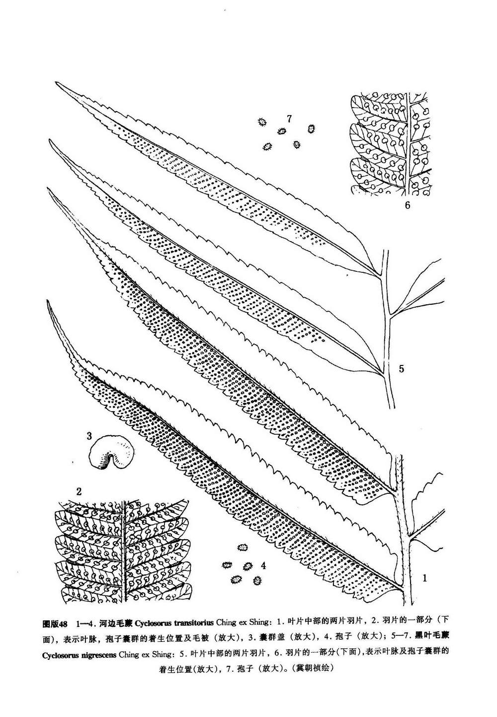 植株高90厘米。根状茎短而横卧。叶远生;叶柄长45厘米,基部粗约4毫米,褐色,向上渐变为禾秆色,无毛;叶片和叶柄等长,中部宽8厘米,长圆披针形,渐尖头,基部略变狭,一回羽状;羽片18-20对,具极短柄,斜上,下部1-2对略缩短,近对生,基部一对长8-9厘米,宽1.5-2厘米,披针形,距上一对6-7厘米,中部羽片互生,相距3-3.5厘米,长12-15厘米,宽1.2-1.5厘米,狭披针形,渐尖头,基部楔形,对称,边缘浅裂呈粗齿牙状,锯齿长2毫米,基部宽3毫米,三角形,先端向前弯,钝尖头,全缘;上部羽片渐短,顶生羽片和其下的同形,略较长,叶脉两面可见,侧脉斜上,每裂片6-8对,下部3-3 1/2 结合,基部一对出自主脉基部,顶端交结成钝三角形网眼,并自交结点向缺刻延伸出一条外行小脉和第二对及第三对侧脉(有时第四对的上侧一脉)连接,在外行小脉两侧形成多个斜长方形网眼,第四对(有时第五对的下侧一脉)伸到缺刻下的透明膜质联线,其余侧脉均伸到缺刻以上的叶边。叶纸质,干后上面黑褐色,光滑,下面褐绿色,沿羽轴及主脉疏被灰白色的伏生长针状毛,脉间无毛。孢子囊群生于侧脉中部,每裂片5-7对;囊群盖中等大,淡褐色,膜质,无毛。