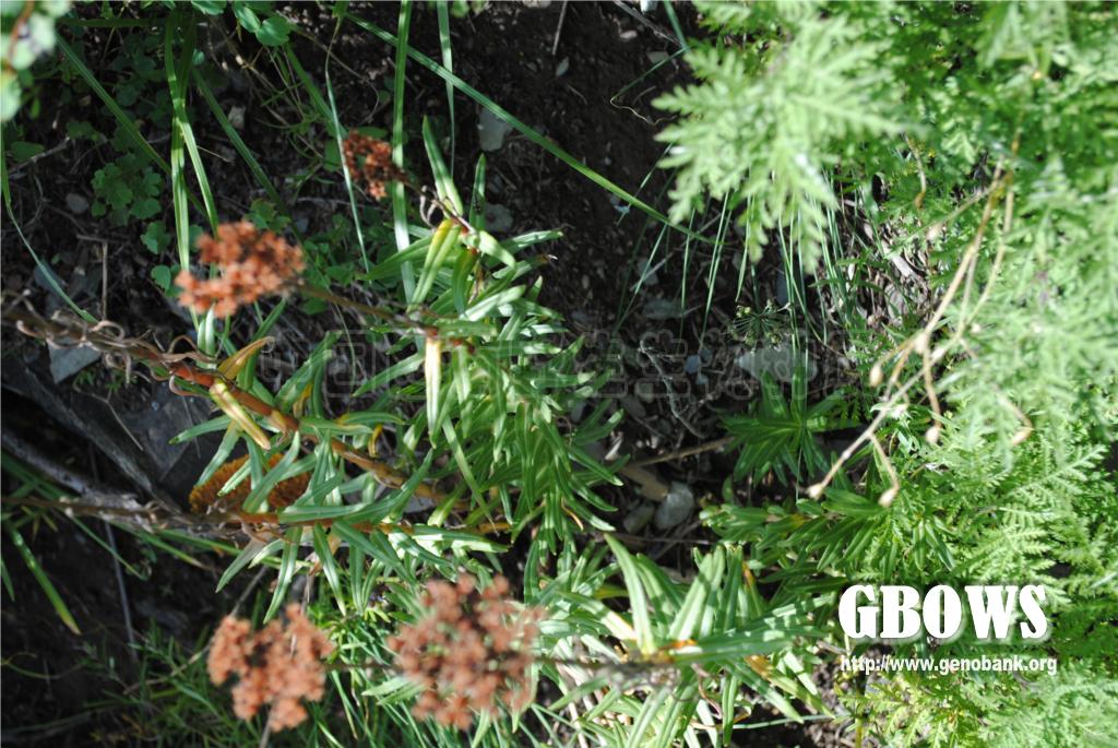 多年生草本。根粗,直立。根颈直径1.5厘米,先端被三角形鳞片。花茎少数,高15-60厘米,少数可达90厘米,直径4-6毫米,叶密生。叶互生,线形至线状披针形,长4-6厘米,宽2-5毫米,先端急尖,边缘有疏锯齿,或有时全缘,无柄。花序伞房状,有多花,宽7-10厘米;雌雄异株;萼片5或4,三角形,长2-2.5毫米,先端急尖;花瓣5或4,绿黄色,倒披针形,长3-4毫米,宽0.8毫米;雄花中雄蕊10或8,与花瓣同长或稍超出,花丝花药黄色;鳞片5或4,近正方形或长方形,长0.8毫米,先端钝或有微缺;心皮5或4,直立。蓇葖披针形,长7-8毫米,有短而外弯的喙;种子长圆状披针形,长1.5毫米。花期6-7月,果期7-8月。