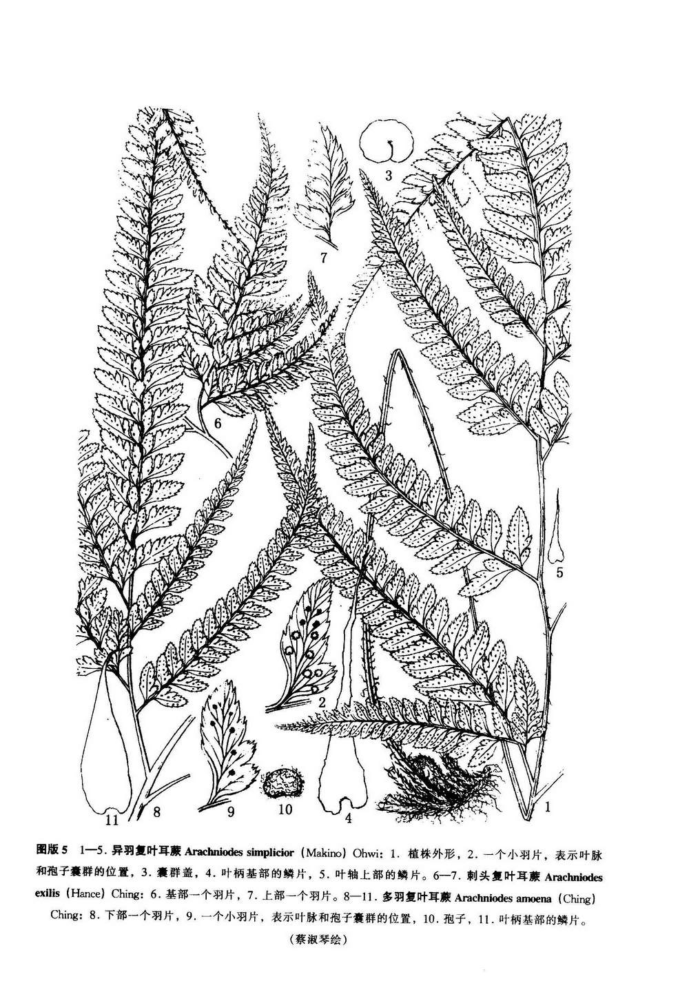 Arachniodes simplicior (Makino) Ohwi in Journ Jap. Bot. 37: 76. 1962; Ching in Acta Bot. Sin. 10: 259. 1962; 中国高等植物图鉴 1: 235. 图469. 1972; 秦岭植物志2: 174. 图版43: 4-5. 1974; 江苏植物志上册, 61. 1976; 河南植物志 1: 99. 图118. 1980: 福建植物志 1: 191. 图179. 1982; 安徽植物志 1: 162. 图165. 1985. ——Polystichum aristatum (Forst.) Sw. var. simplicius Makino Bot. Mag. Tokyo. 15: 65. 1901.——Polystichum simplicius (Makino) Tagawa in Acta Phytotax. Geobot. 1: 90. 1932.——Rumohra simplicior (Makino) Ching in Sinensia 5: 43. t. 2. 1934; 傅书遐, 中国主要植物图说. 蕨类植物门 187. 图 251. 1957. ——Polystchopsis simplicior (Makino) Tagawa in Journ. Jap. Bot. 33: 95. 1958 et Col. Illustr. Jap. Pterid. 87. t. 29. f. 170a. 1959.