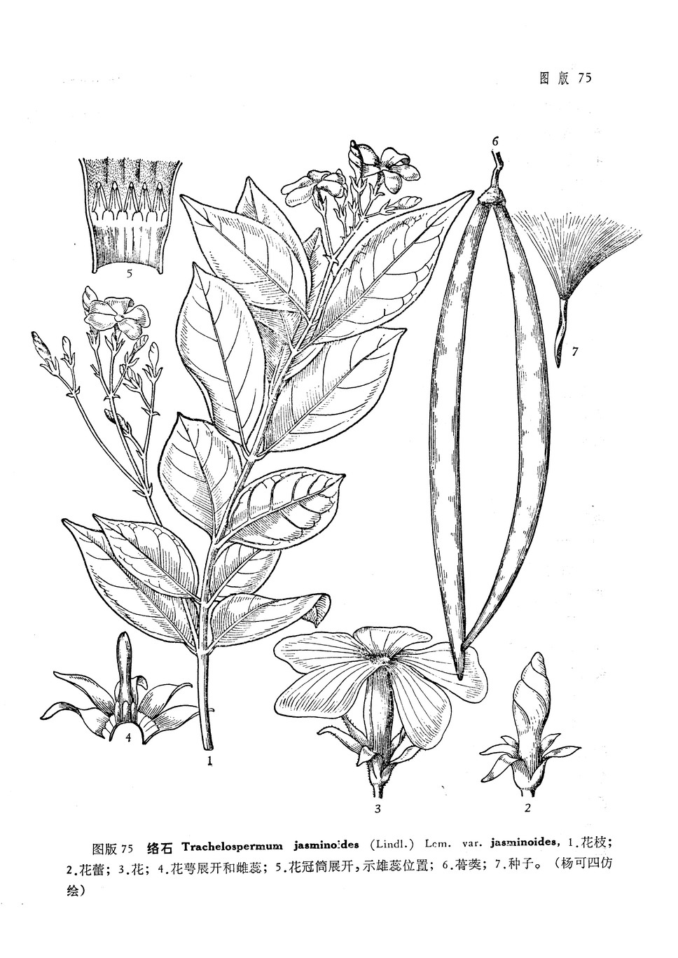 常绿木质藤本,长达10米,具乳汁;茎赤褐色,圆柱形,有皮孔;小枝被黄色柔毛,老时渐无毛。叶革质或近革质,椭圆形至卵状椭圆形或宽倒卵形,长2-10厘米,宽1-4.5厘米,顶端锐尖至渐尖或钝,有时微凹或有小凸尖,基部渐狭至钝,叶面无毛,叶背被疏短柔毛,老渐无毛;叶面中脉微凹,侧脉扁平,叶背中脉凸起,侧脉每边6-12条,扁平或稍凸起;叶柄短,被短柔毛,老渐无毛;叶柄内和叶腋外腺体钻形,长约1毫米。二歧聚伞花序腋生或顶生,花多朵组成圆锥状,与叶等长或较长;花白色,芳香;总花梗长2-5厘米,被柔毛,老时渐无毛;苞片及小苞片狭披针形,长1-2毫米;花萼5深裂,裂片线状披针形,顶部反卷,长2-5毫米,外面被有长柔毛及缘毛,内面无毛,基部具10枚鳞片状腺体;花蕾顶端钝,花冠筒圆筒形,中部膨大,外面无毛,内面在喉部及雄蕊着生处被短柔毛,长5-10毫米,花冠裂片长5-10毫米,无毛;雄蕊着生在花冠筒中部,腹部粘生在柱头上,花药箭头状,基部具耳,隐藏在花喉内;花盘环状5裂与子房等长;子房由2个离生心皮组成,无毛,花柱圆柱状,柱头卵圆形,顶端全缘;每心皮有胚珠多颗,着生于2个并生的侧膜胎座上。蓇葖双生,叉开,无毛,线状披针形,向先端渐尖,长10-20厘米,宽3-10毫米;种子多颗,褐色,线形,长1.5-2厘米,直径约2毫米,顶端具白色绢质种毛;种毛长1.5-3厘米。花期3-7月,果期7-12月。