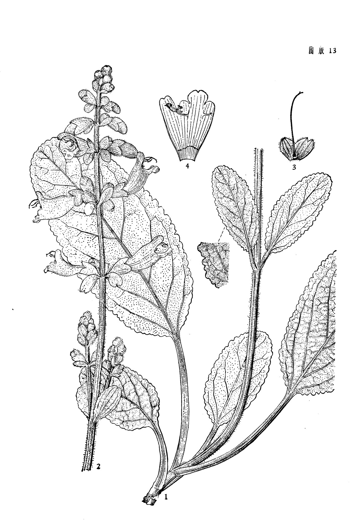多年生直立草本。茎高30-60厘米,密被长柔毛。叶通常为基出叶,间有茎生叶,叶片长圆状椭圆形,长3.5-11厘米,宽2-5厘米,先端钝或圆形,基部圆形,边缘具圆齿,坚纸质,上面深绿色,被疏柔毛,下面微皱,密被白色短绒毛;基出叶叶柄长6-8厘米,茎生叶具短柄或至无柄。轮伞花序4-6花,3-8组成长13厘米顶生的总状花序,有时由于此花序下部分枝而成圆锥花序;苞片倒卵圆形或卵圆形,全缘,被长柔毛;花梗长3-4毫米,与序轴密被长柔毛。花萼钟形,长10-12毫米,展开后先端宽10毫米,鲜绿色,外面被长柔毛,具紫脉,内面被小粗伏毛,二唇形,上唇宽三角形,长2-2.5毫米,宽5.6毫米,边缘被长柔毛,先端有靠近的三尖突,下唇较上唇稍大,半裂成2齿,齿宽三角形,先端锐尖。花冠黄色,有淡紫色的斑点,长3.3-3.5厘米,外面被小疏柔毛,内面离基部5毫米有斜向小疏柔毛毛环,冠筒伸出萼外,长约2.4厘米,基部宽约2.5毫米,渐向上弯曲,并渐膨大,至喉部宽达1厘米,冠檐二唇形,上唇长圆形,长8毫米,宽7毫米,先端圆形或微凹,下唇较上唇大,长12毫米,宽13毫米,3裂,中裂片倒心形,宽达10毫米,侧裂片半圆形,宽约4毫米。能育雄蕊略伸出花冠,花丝扁平,水平状伸出,长7毫米,药隔长6毫米,弧形,上臂和下臂等长,二下臂有斜生的药室,并互相联合。花柱超出花冠很远,先端不相等2浅裂,后裂片极短。花盘前方稍膨大。子房裂片卵圆形。小坚果灰黑色,倒卵圆形,腹面具稜,长4毫米,宽2.5毫米,光滑。花期4-6月。