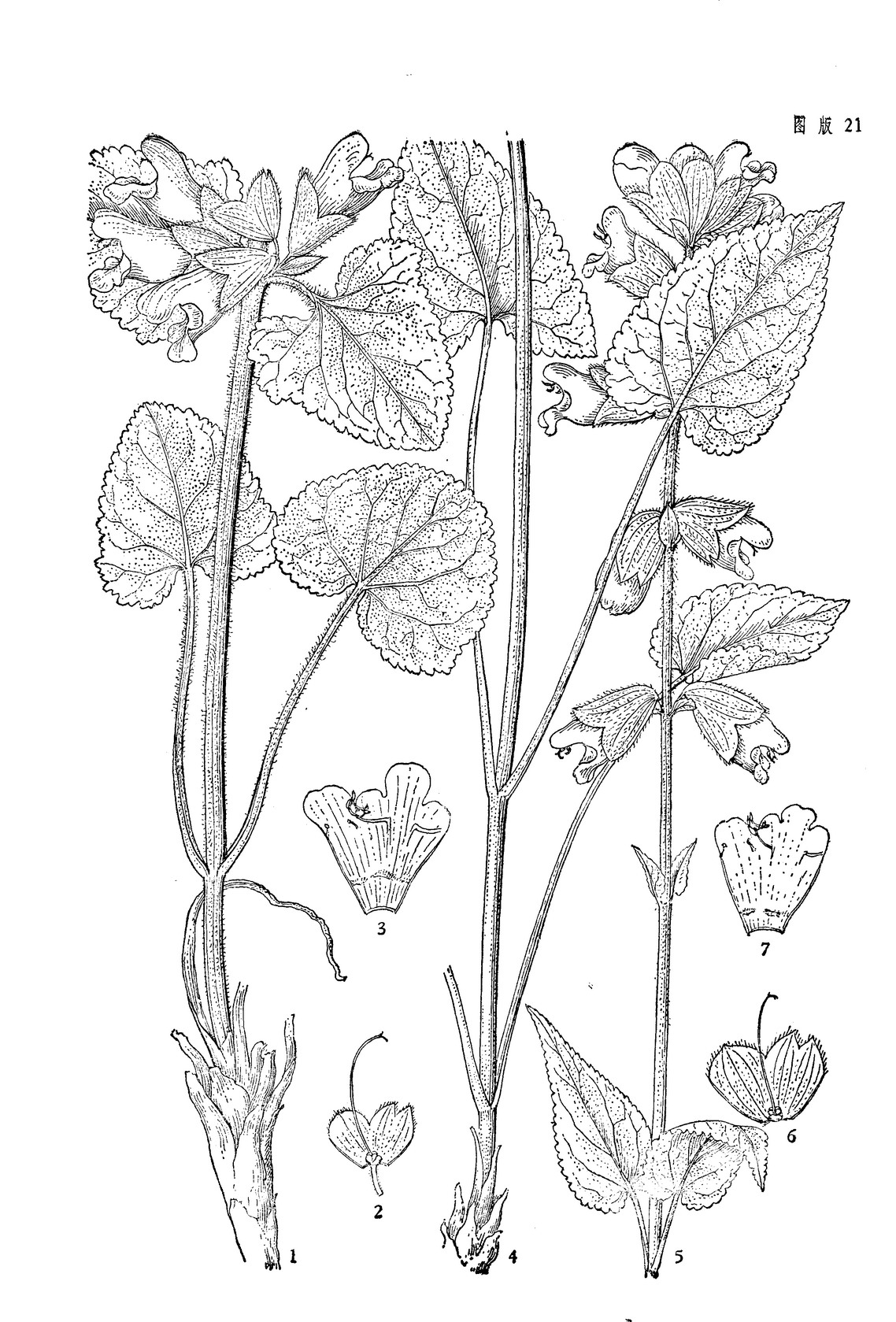 多年生草本;根茎粗大,单一或分枝,其上密生鳞片,鳞片呈卵圆状三角形或披针形,长达2厘米,根茎下方有斜升扭曲状的条状根。茎直立,高13-45厘米,具条纹,密被棕色长柔毛或变无毛。叶有根出叶和茎生叶两种,叶片均卵圆形或三角状卵圆形,长2-11厘米,宽与长约相等或仅及长之半,先端急尖或钝至圆形,基部深凹或心形,稀浅戟形,边缘有不整齐的小圆齿,草质,干时略具皱,上面密被平伏长柔毛,下面沿脉网上被平展褐色长柔毛,全面散布深褐色腺点;叶柄长2-10(20)厘米,基出叶叶柄最长,长约为叶片2-2.5倍,基部明显宽大呈鞘状,茎生叶渐向上渐短,基部稍宽大,被毛同茎。轮伞花序6花,上部者密集,下部者稍疏离,组成长10-20厘米的总状花序或总状圆锥花序;下部苞片与叶相似,较花萼长,上部苞片卵圆形,与花萼等长或较短,均先端突渐尖或短尖,边缘全缘,上面略被下面沿脉上被疏柔毛,具长柔毛状缘毛;花梗长约8毫米,与序轴被褐色长柔毛。花萼阔钟形,长14-17毫米,外面沿脉上被长柔毛,其间散布深褐色腺点,内面被微硬伏毛,二唇形,上唇阔卵圆形,长约5毫米,宽达13毫米,全缘或具3短尖,下唇较上唇长,半裂成2齿,齿三角形,先端具长达1毫米的刺尖。花冠蓝紫色或紫色,基部为黄色,直伸,长2.6-3.5厘米,外被疏柔毛,内面离冠筒基部8-10毫米有斜向间断疏柔毛毛环,冠筒在毛环以下筒状,宽约5毫米,自毛环以上突然腹状膨大,至喉部宽约1.1厘米,长约为花萼长之2倍,冠檐二唇形,上唇直伸,半圆形,长5-7毫米,顶端微凹,下唇3裂,中裂片最大,长5毫米,宽8毫米。顶端微凹,侧裂片卵圆形,宽4毫米。能育雄蕊伸在上唇下,花丝扁平,长4.5毫米,药隔短,长2-3毫米,弯成弧形,上下臂近等长或下臂略短,二下臂先端横生药室,药室先端联合;退化雄蕊短小,长不及1毫米。花柱内藏,先端不相等2浅裂,后裂片短。花盘前方稍膨大。花期7-10月。
