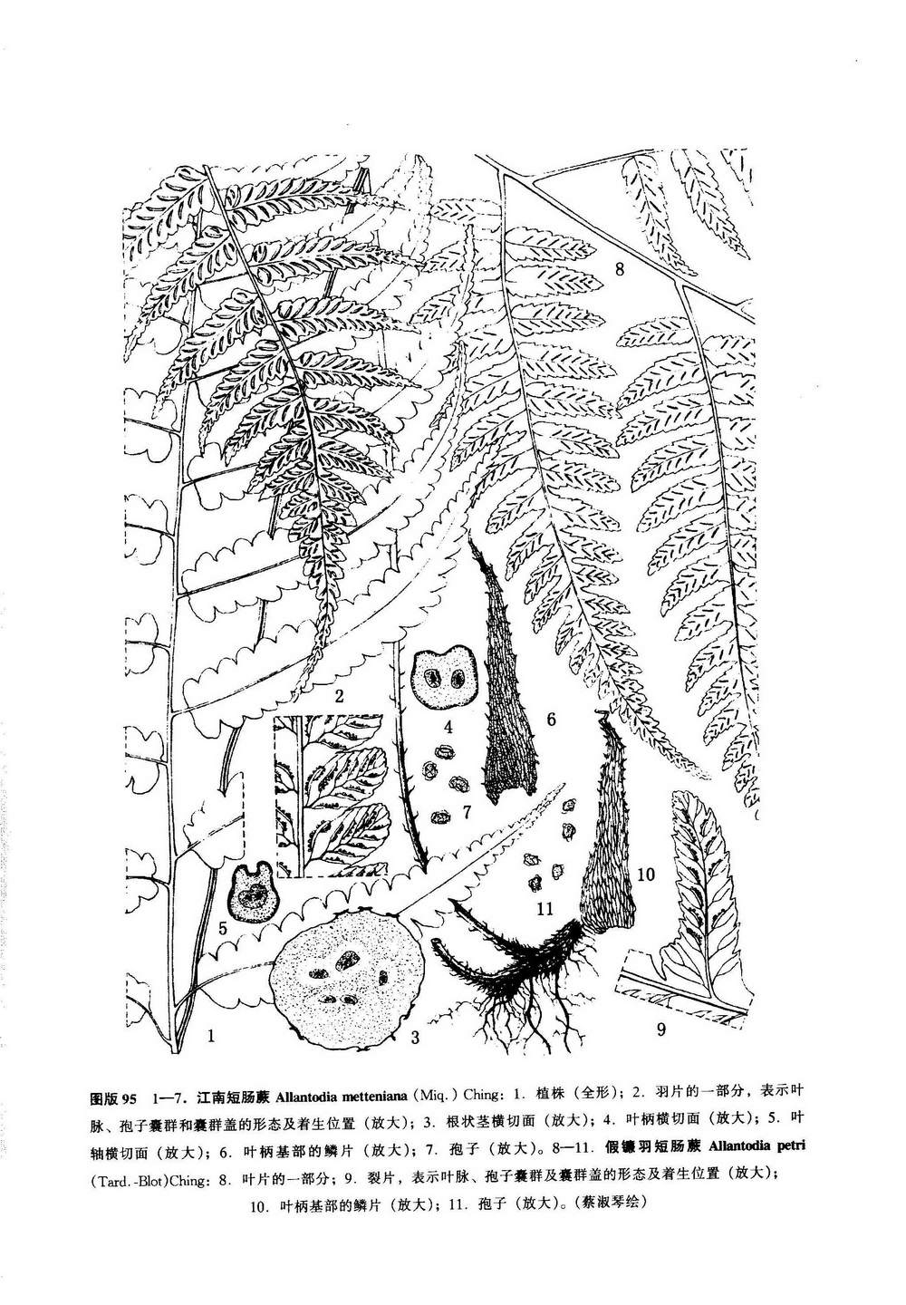 常绿中型林下植物。根状茎长而横走,直径3毫米,黑褐色,先端密被鳞片;鳞片狭披针形,长约3毫米,黑色或黑褐色,有光泽,厚膜质,边缘有小齿;叶远生。能育叶长达70厘米;叶柄长30-40厘米,直径2-3毫米,基部褐色,疏被狭披针形的褐色鳞片,向上有浅纵沟;叶片三角形或三角状阔披针形,长25-40厘米,基部宽20-25厘米,羽裂长渐尖的顶部以下一回羽状-羽片羽状浅裂至深裂;侧生羽片约10对,互生或近对生,近平展,镰状披针形或矩圆披针形,长达18厘米,宽达4厘米,顶部长渐尖,两侧羽状浅裂至深裂,基部截形或阔楔形,基部的柄长达1.5厘米,向上的柄渐短至无柄或贴生;侧生羽片的裂片约达15对,稍斜展,密接,半圆形或镰状披针形,圆头或短渐尖头,边缘有浅钝锯齿;叶脉羽状,上面不明显,下面可见,小脉单一或基部的偶有二叉,斜向上,在侧生羽片的裂片上约达5-7对。叶纸质,干后绿色或灰绿色,两面光滑;叶轴禾秆色,光滑,上面有浅纵沟。孢子囊群线形,略弯曲,在侧生羽片的裂片上有2-5(-7)对,偶为1条,大多单生于小脉上侧中部,在基部上侧1脉常为双生;囊群盖浅褐色,薄膜质,全缘,宿存。孢子近肾形,周壁透明,具少数褶皱,表面具不明显的颗粒状纹饰。染色体数目n=82。