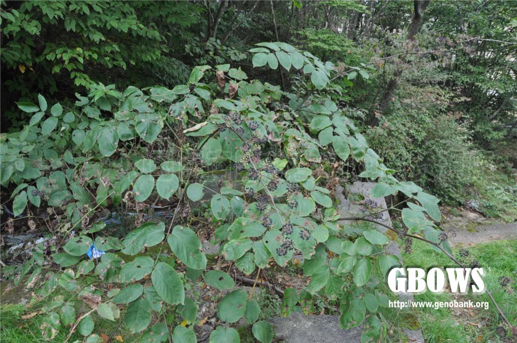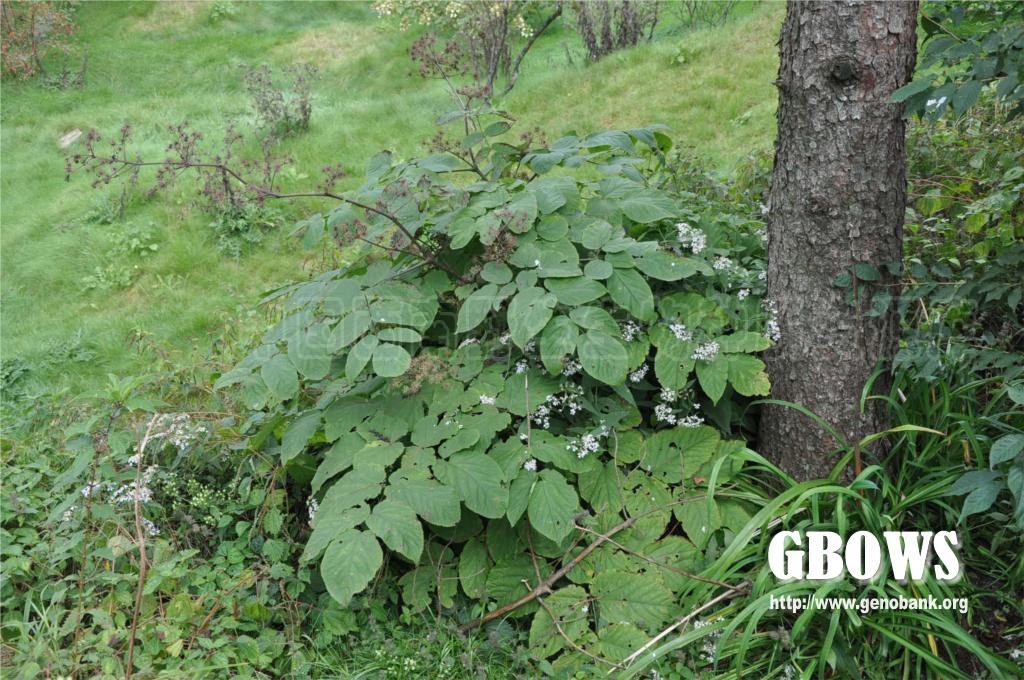 多年生草本,地下有长圆柱状根茎;地上茎高0.5-3米,粗壮,基部直径可达2厘米。叶为二回或三回羽状复叶;叶柄长15-30厘米,无毛或疏生短柔毛;托叶和叶柄基部合生,先端离生部分锥形,长约3毫米,边缘有纤毛;羽片有小叶3-5; 小叶片膜质或薄纸质,长卵形至长圆状卵形,长4-15厘米,宽3-7厘米,先端突尖,基部圆形至心形,侧生小叶片基部歪斜,上面无毛,下面脉上疏生短柔毛,边缘有粗锯齿,基部有放射状脉3条,中脉有侧脉6-8对,上面不甚明显,下面隆起而明显,网脉在上面不明显,下面明显;小叶柄长达2.5厘米,顶生的长可达5厘米。圆锥花序大,顶生或腋生,长达50厘米,稀疏;分枝少,着生数个总状排列的伞形花序;伞形花序直径1.5-2.5厘米,有花多数或少数;总花梗长1-5厘米,有短柔毛;苞片线形,长3-5毫米;花梗通常丝状,长10-12毫米,有短柔毛;小苞片长约2毫米;花白色;萼无毛,长 1.2-1.5毫米,边缘有5个三角形尖齿;花瓣5,卵状三角形,长约1.5毫米,开花时反曲;雄蕊5,长约2毫米;子房5室;花柱5,离生。果实球形,紫黑色,直径约3毫米,有5稜;宿存花柱长约2毫米,离生或仅基部合生。花期7-8月,果期9-10月。